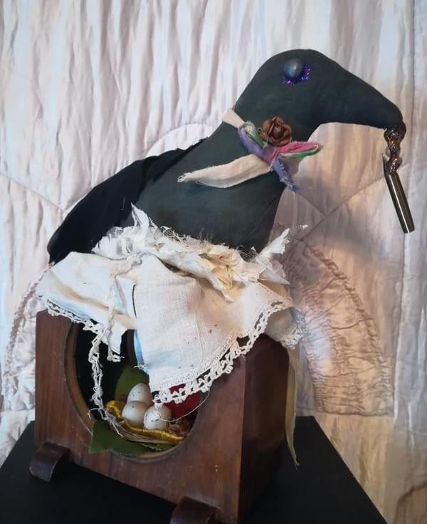 Housed on one of my collection of vintage and antique clock bases, in which I created a nest.