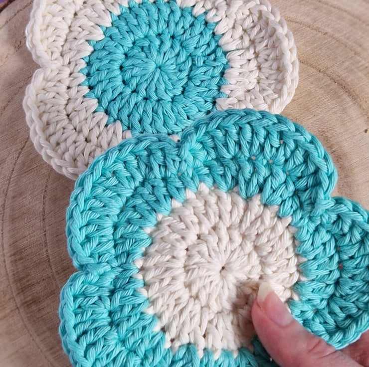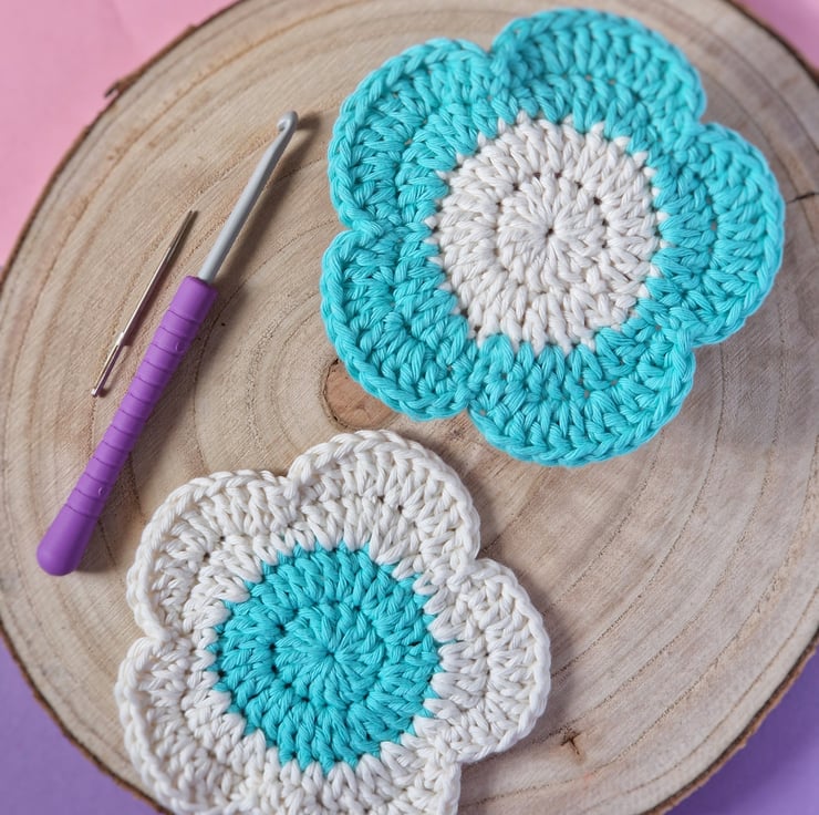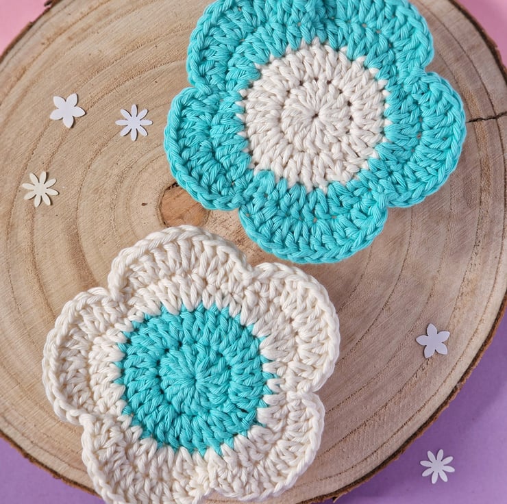 Blue and cream flower coasters in a set of two! Can be used as vibrant, fun home decor for kitchens, home offices and more. An ideal housewarming gift or an adorable mothers day gift. Hand crocheted from supersoft cotton for absorbancy, they can be gently handwashed and dried flat. I have other flower colours, please have a look through my shop, SquirrelScribbles!