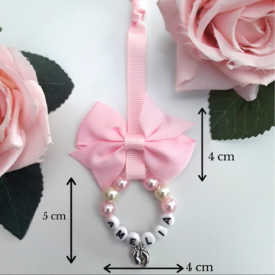 Pearl beads personalised with child's name and hanging baby feet charm and bow to finish, safety pin included to attach to pram hood