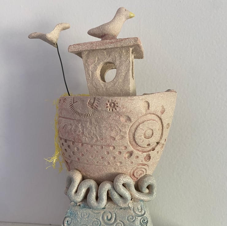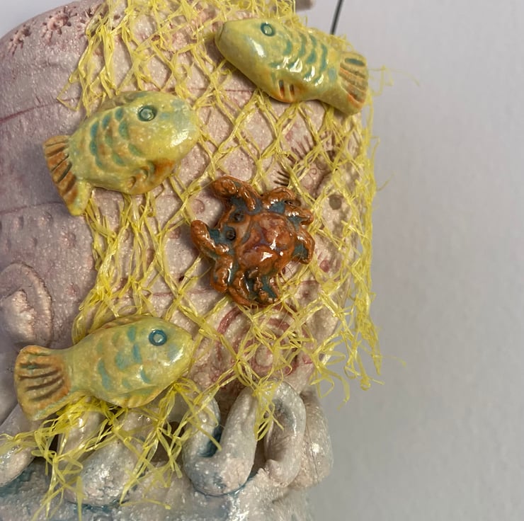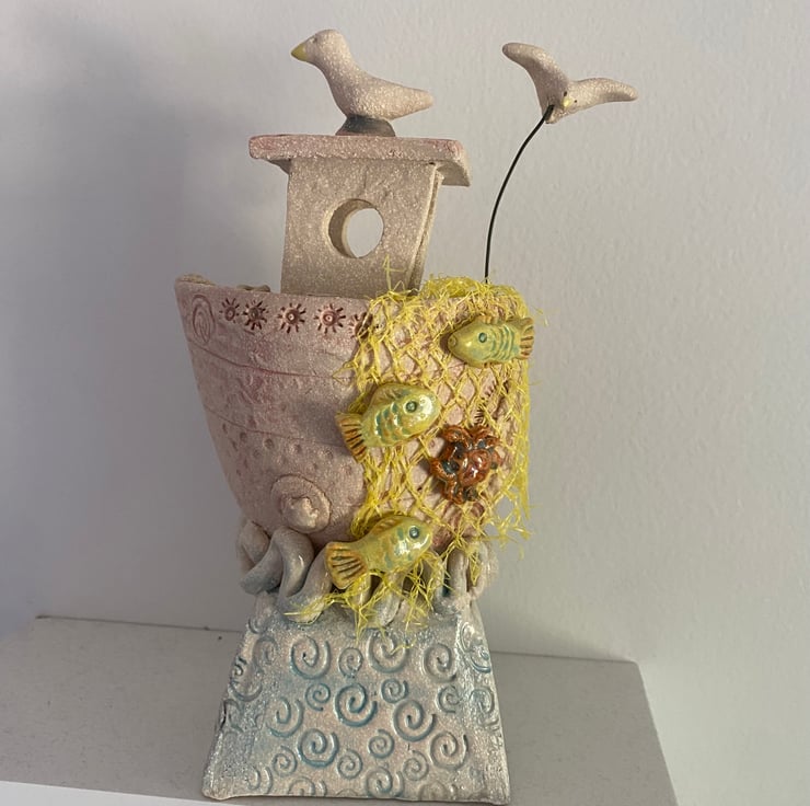 I really let my imagination run riot on this one! It encompasses two of my great loves… walking by the sea and creating quirky pottery full of pattern and texture.