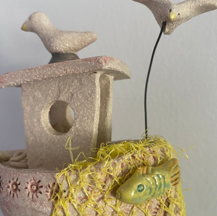 Beautiful little quirky fishing boat featuring a pretty good catch and some hungry seagulls!