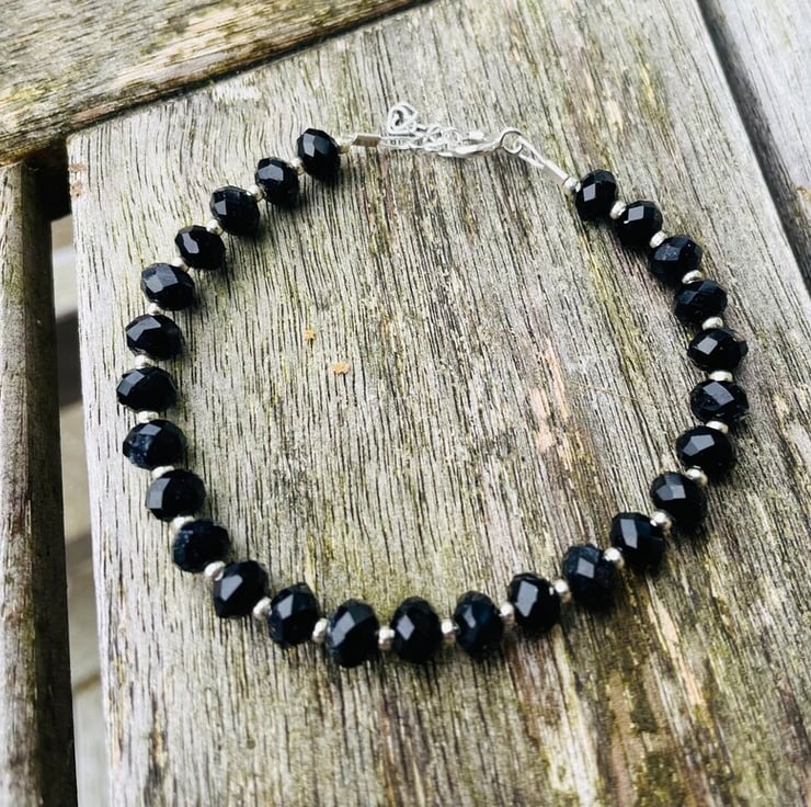 Black Crystal beaded bracelet, pearls are approx 5-6mm in siZe.l with silver seed beads on between each pearl. Ends with a sterling silver heart chain and clasp. The bracelet is 6.5 inches with an extra 1.inch extension chain so can be worn up to 7.5 inches at its largest fastening. Free gift pouch. Last one left!
