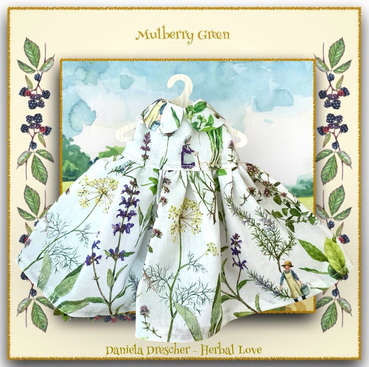 A beautiful dress in Daniela Drescher designer fabric - Herb Love, to fit the Mulberry Green characters. The dress is made from best quality cotton and has a Peter Pan collar and a lined bodice.