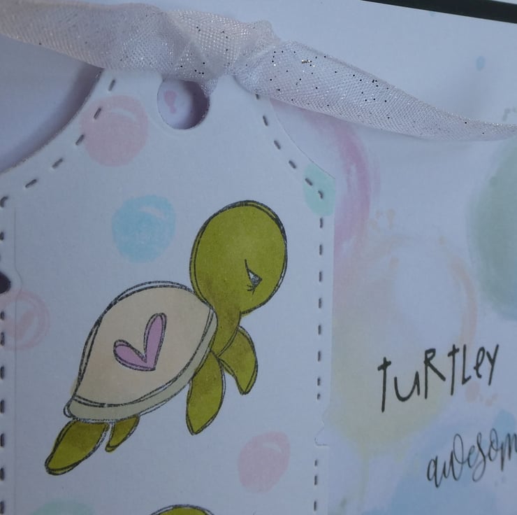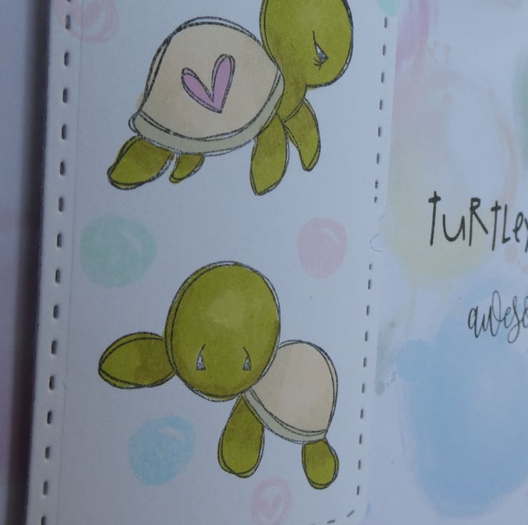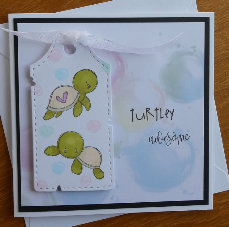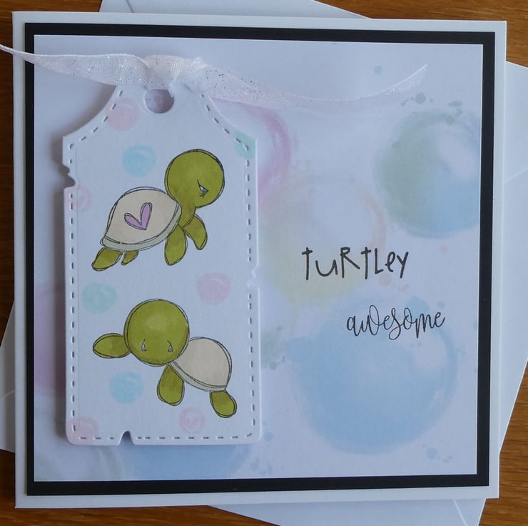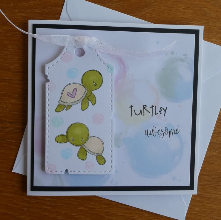 This card, hand stamped with an image of turtles with a watercolour effect background and the message 'turtley awesome' would make a lovely birthday or thank you card.