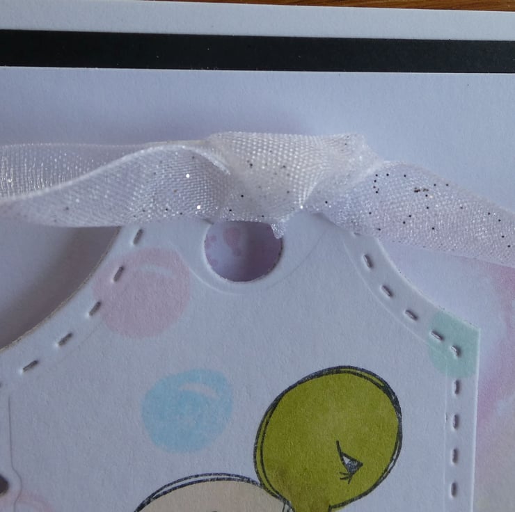 The tag has been finished with hand stamped bubles in pastel shades of pink and aquamarine and then tied with a white and silver organza ribbon. It has been mounted onto a background paper patterned with a watercolour bubble effect in pinks, yellow, blue and green.