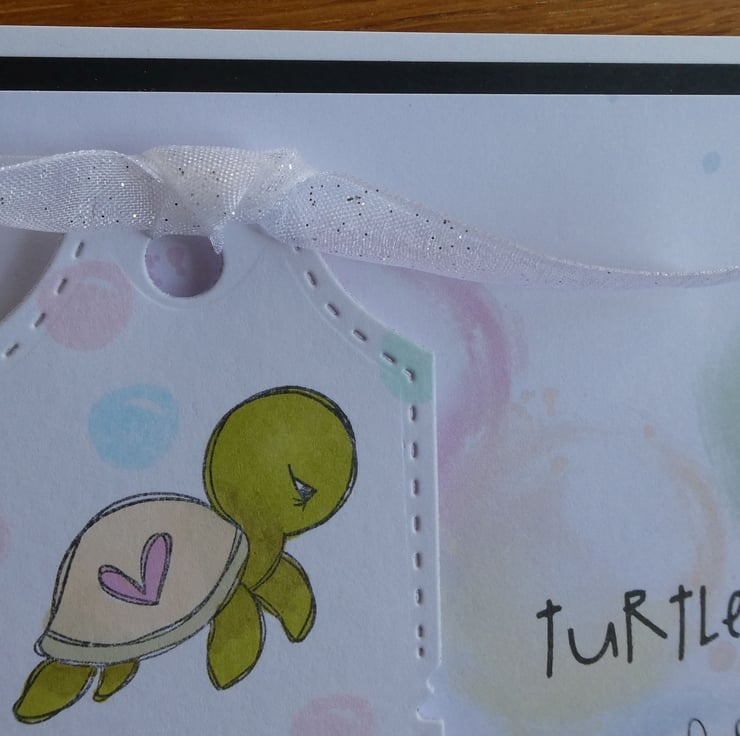 Two turtles, one with a pink heart detail on it's shell, have been hand stamped and coloured in several shades of green, cream and pink onto a tag shaped piece of thick white card.