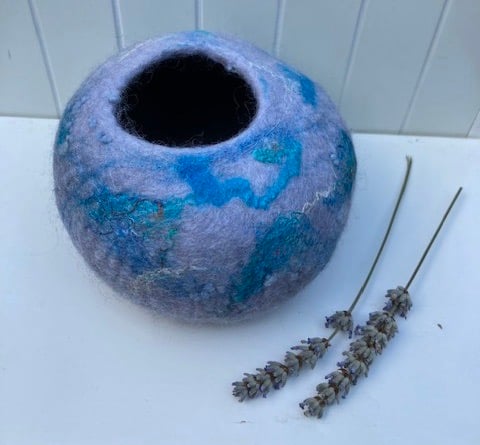 This delicate round felted bowl has been made using the wet felting process Grey merino wool has been felted to shape the bowl & blue wool nips and sari silk have been added to give the feeling of the sea.