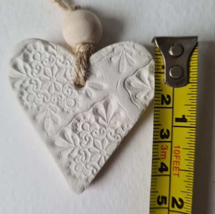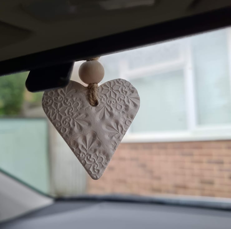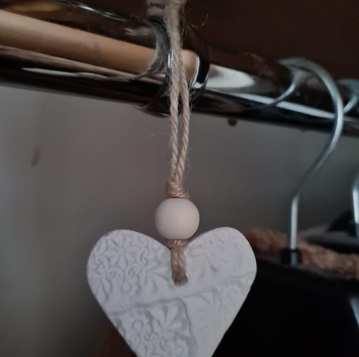 This pretty heart clay hanging decoration is made from air-drying clay, tied with twine and a wooden bead to finish. It is unsealed so it can absorb essential oil. The pattern is on one side, the other side left plain and it measures approx 4.5x4.5cm.