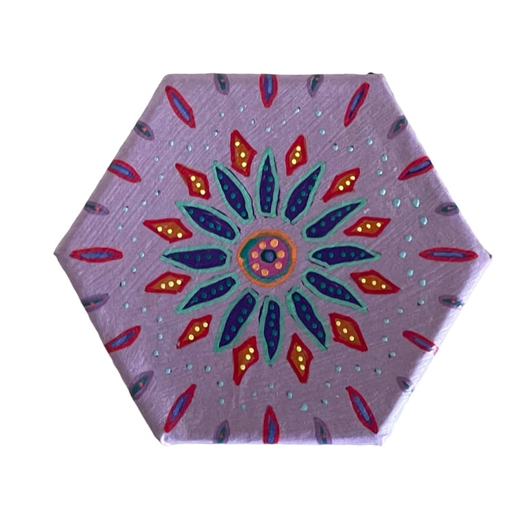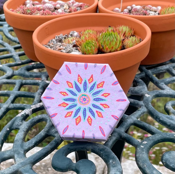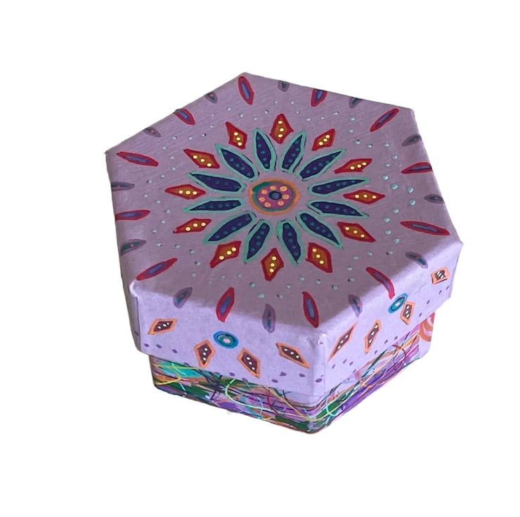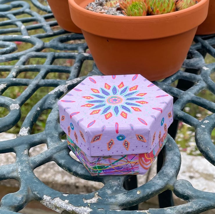 This small, versatile, lidded hexagonal box pot has a cardboard core, covered in a hand painted design using acrylic paints.