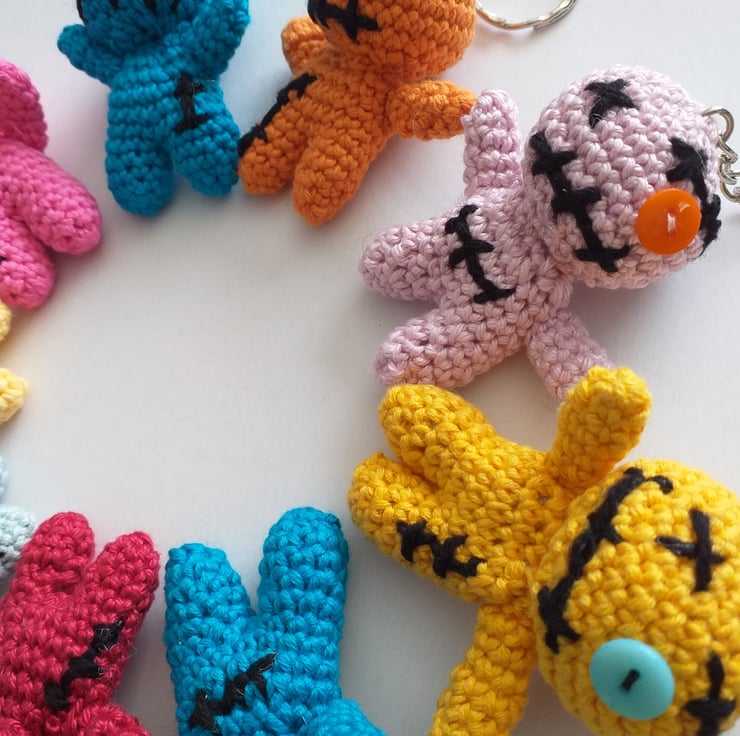 Crocheted in cotton yarn, each one had a button for an eye and black stitches in a variety of fun colours.