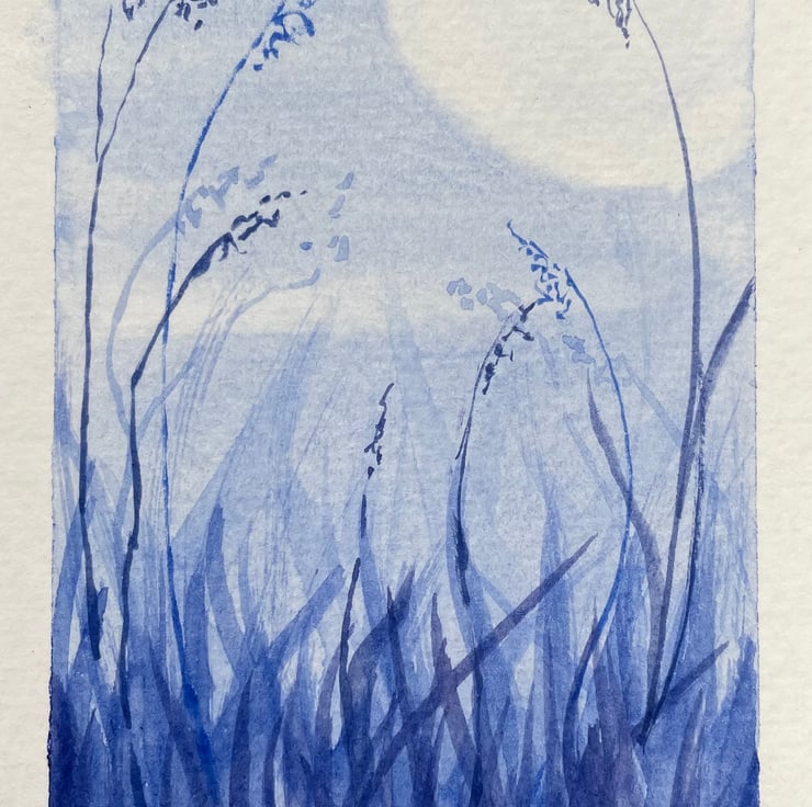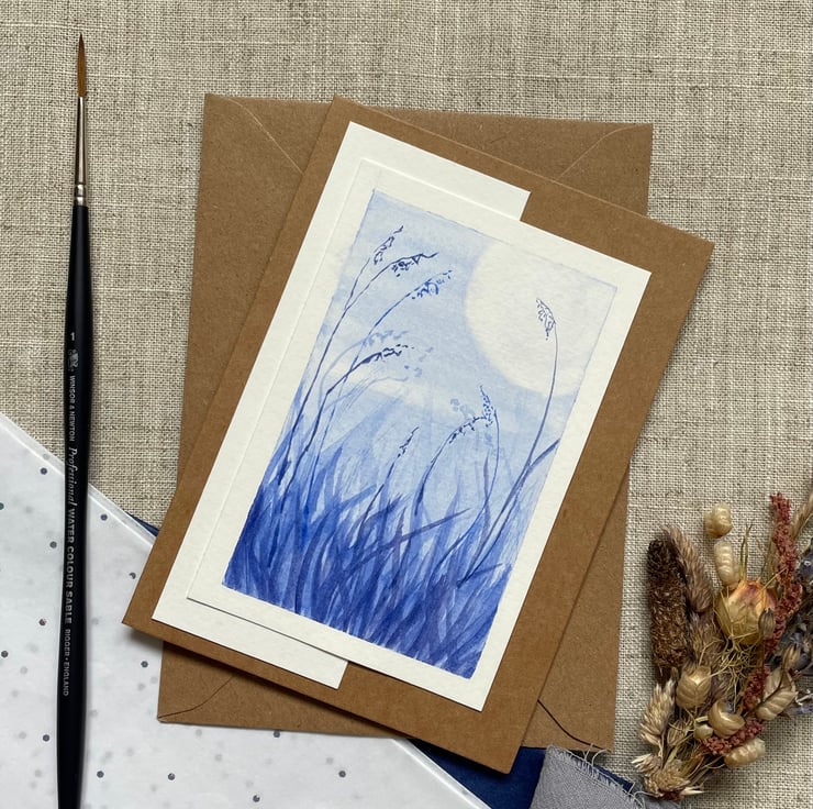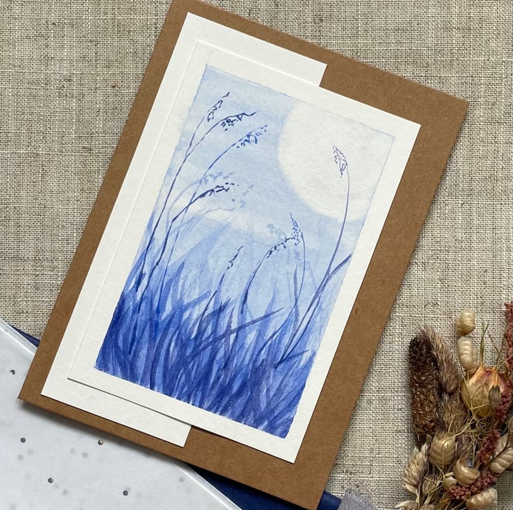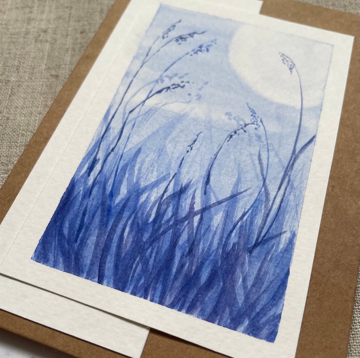 This blank greeting card features hand painted grasses in the moonlight, painted in watercolour and mounted onto an off white background border, the card has been left blank for any occasion and would make a lovely card for a birthday, Mother's Day, or just sending a pretty note to a friend.