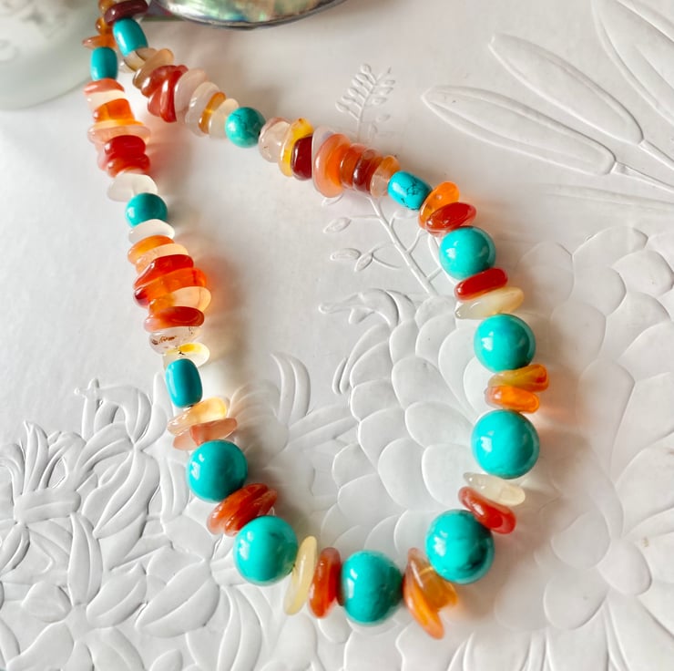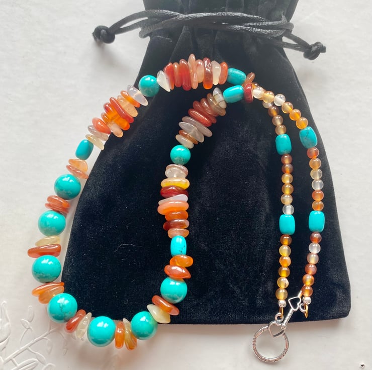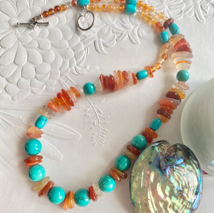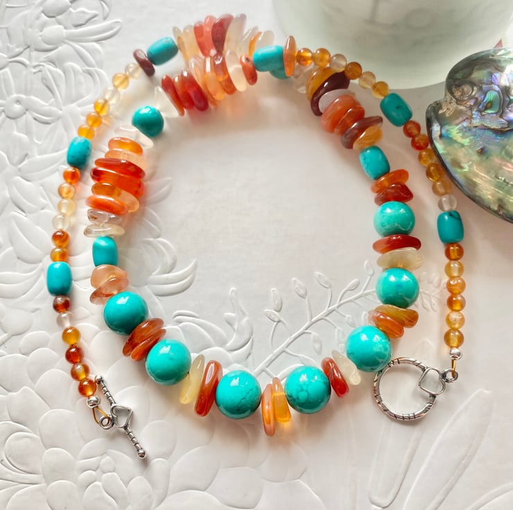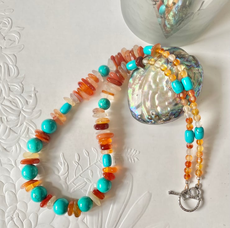 An absolutely stunning handmade necklace featuring Carnelian nuggets and Chinese Turquoise. I have finished the necklace with an etched 925 sterling silver toggle clasp, with a lovely heart detail, making it extremely easy to fasten.