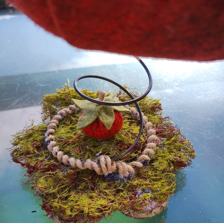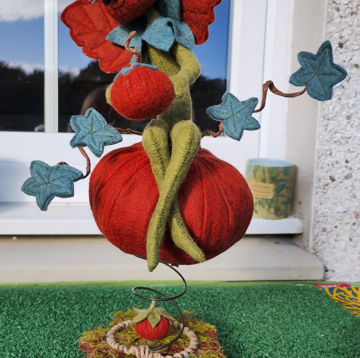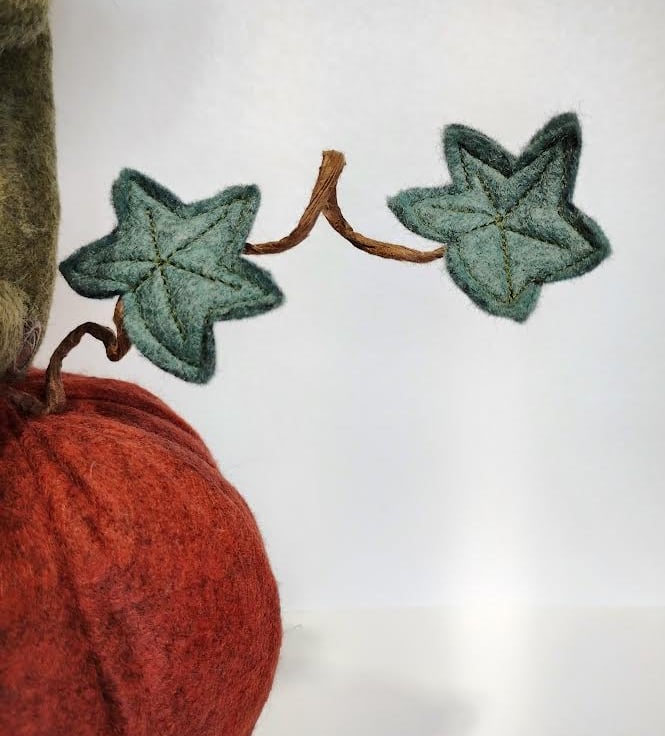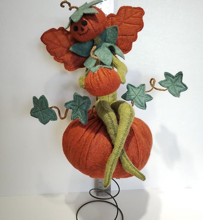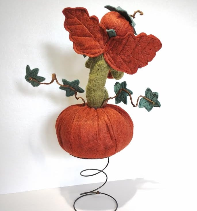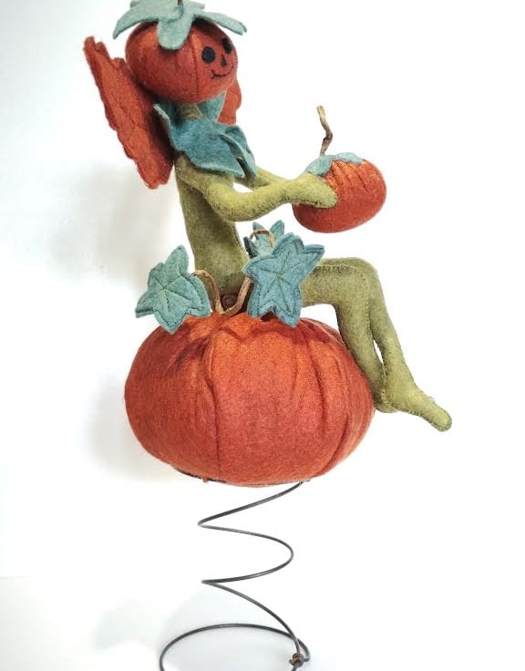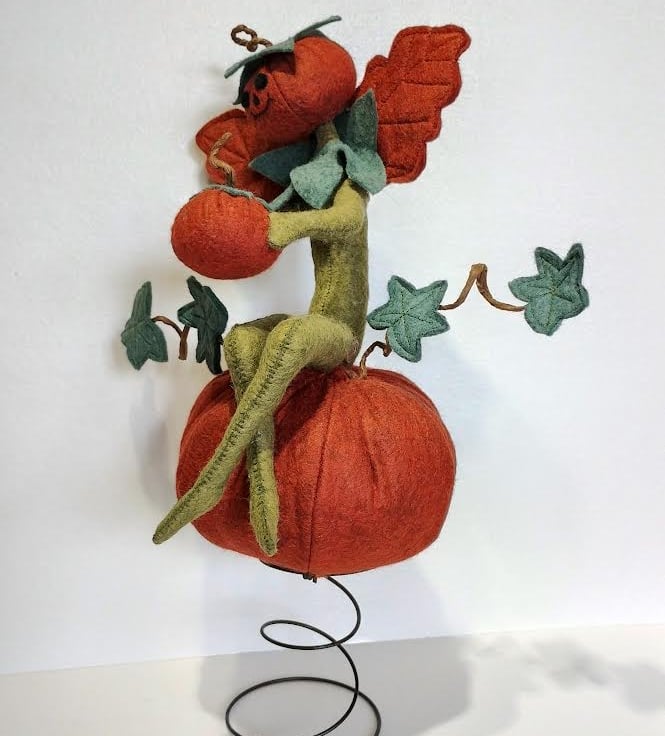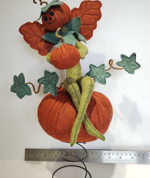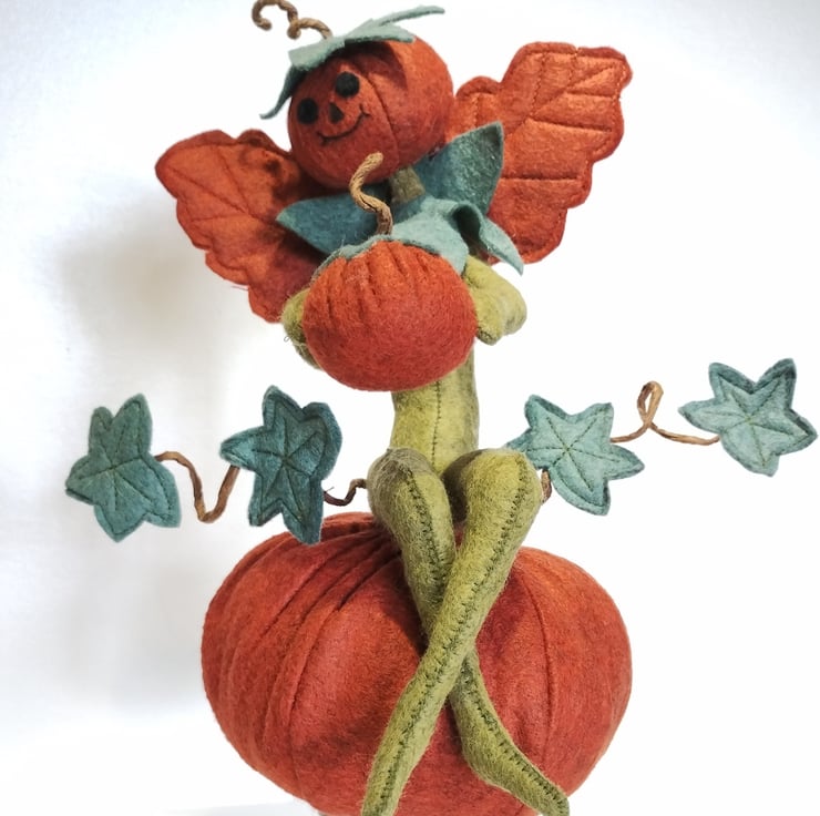 This super gorgeous cheeky elf is holding onto his very own pumpkin, then found one of those really big pumpkins in the farmer's pumpkin patch and took up residence on it. All made with wool felts, hand sewn together using DMC threads, and filled with UK-quality stuffing. Elf's wings are attached securely to his back. The vine tendrils are made using crafters wire and twisted into shape to hold the vine leaves. These tendrils are pliable and will easily move back into place should they lose their shape. Just be careful if you need to do this, as they are delicate. The base with a very small pumpkin attached is made with wood cuttings and covered with moss. Handle carefully.
