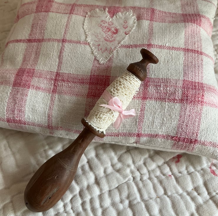 It comes with a metre of vintage French lace, wound on the bobbin and secured with a silk ribbon bow.