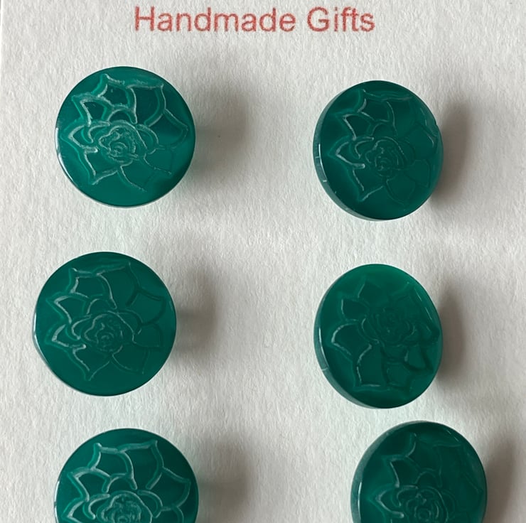 Pretty green floral print round plastic buttons. Lovely and shiny which is difficult to photograph.