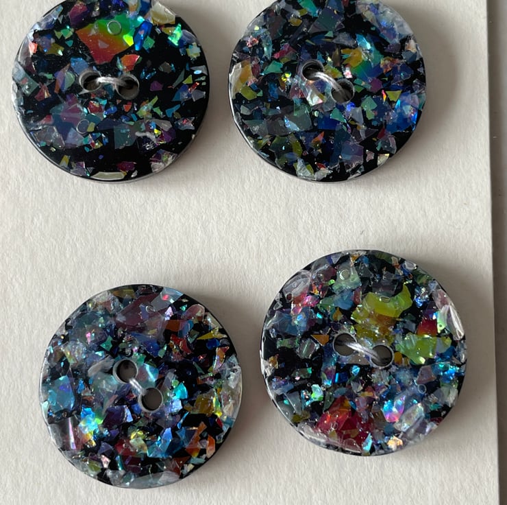 Pretty multicoloured round plastic buttons with pink, green, yellow, silver and blue.
