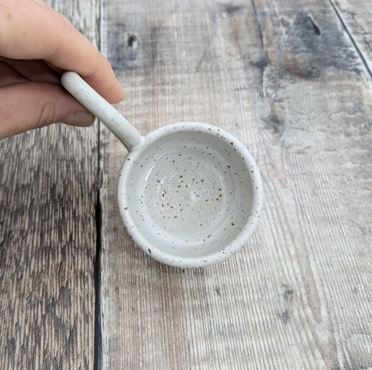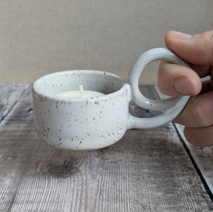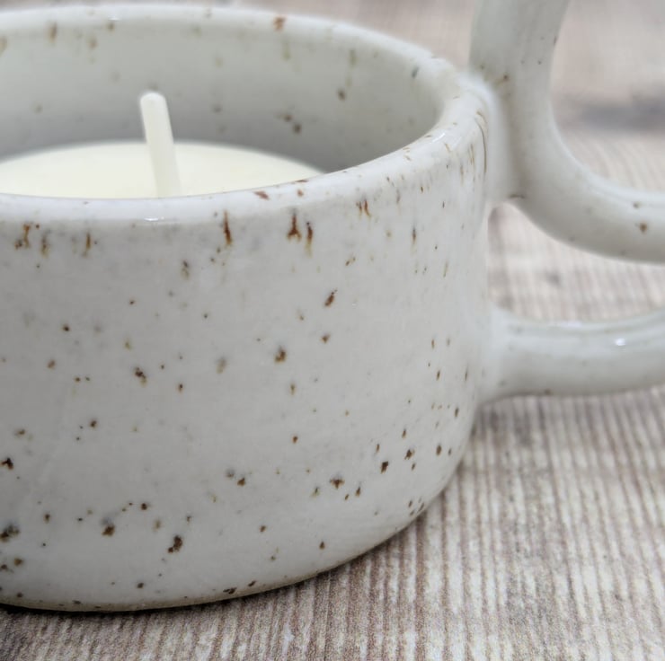 A ceramic tealight holder, wheel thrown in a speckled stoneware clay. A hand built handle is added on one side. It is glazed in a speckled white glaze to compliment the clay.