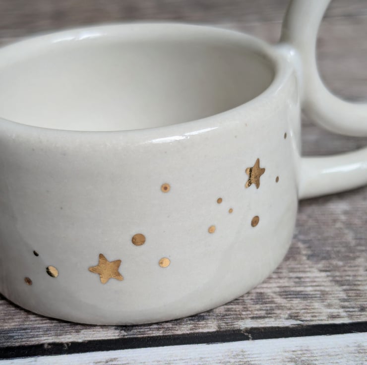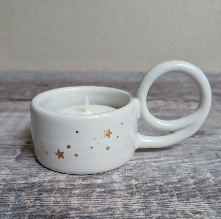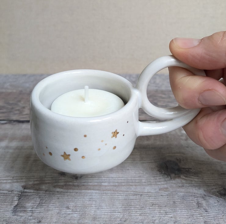 A ceramic tealight holder, wheel thrown in a white stoneware clay. A hand built handle is added on one side. It has had a third kiln firing after 24 karat gold stars have been hand painted on the front and back. Clean only with a soft cloth to protect the gold.