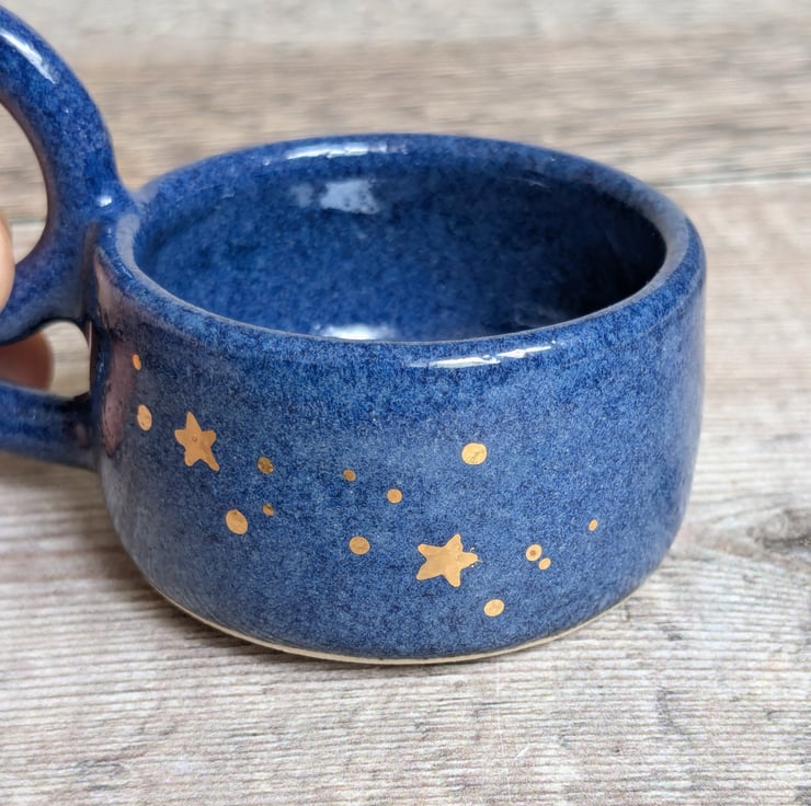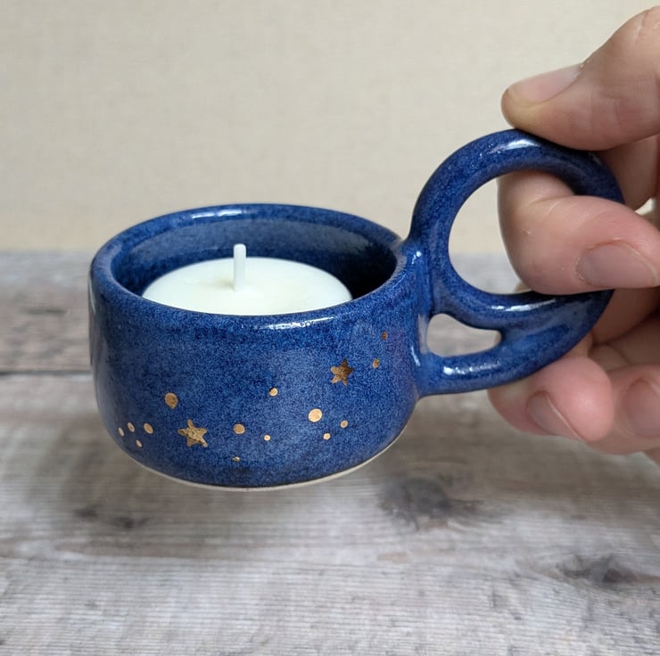 A ceramic tealight holder, wheel thrown in a white stoneware clay and glazed blue. A hand built handle is added on one side. It has had a third kiln firing after 24 karat gold stars have been hand painted on the front and back. Clean only with a soft cloth to protect the gold.