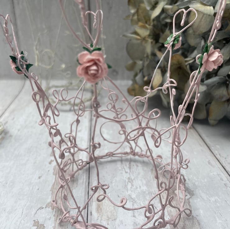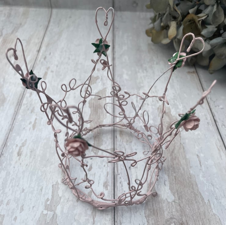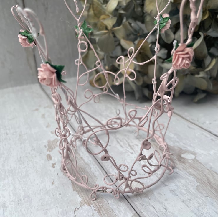 Handmade wire crown approximately 20cm tall, hand painted with pigment rich British heritage paint in delicate shell pink and decorated with tiny mulberry paper roses. Every crown is unique and no two will ever be the same. The crown comes with a fairytale tag attached with hand dyed pure silk ribbon.