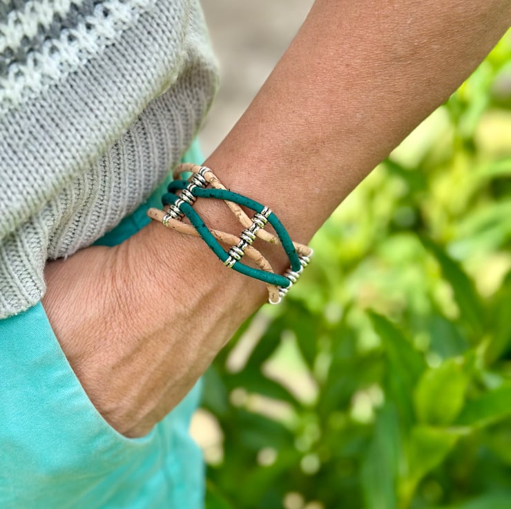An unusual but elegant lightweight bracelet, made from natural Portuguese cork 'leather' (completely Vegan) and antique silver effect bars creating a stunning bracelet that can be worn casually on holiday or works equally well with a dressier outfit.