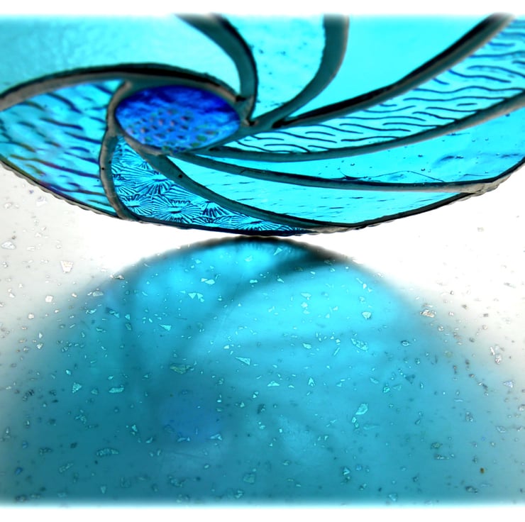I've formed the waves into a circle and used lots of types of gorgeous turquoise textured glass for the effect of the rolling waves. In the centre is a lovely turquoise nugget topped with precious dichroic glass which I fused specially for this suncatcher in my kiln..