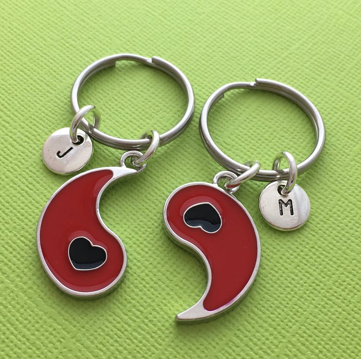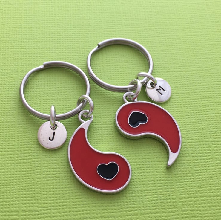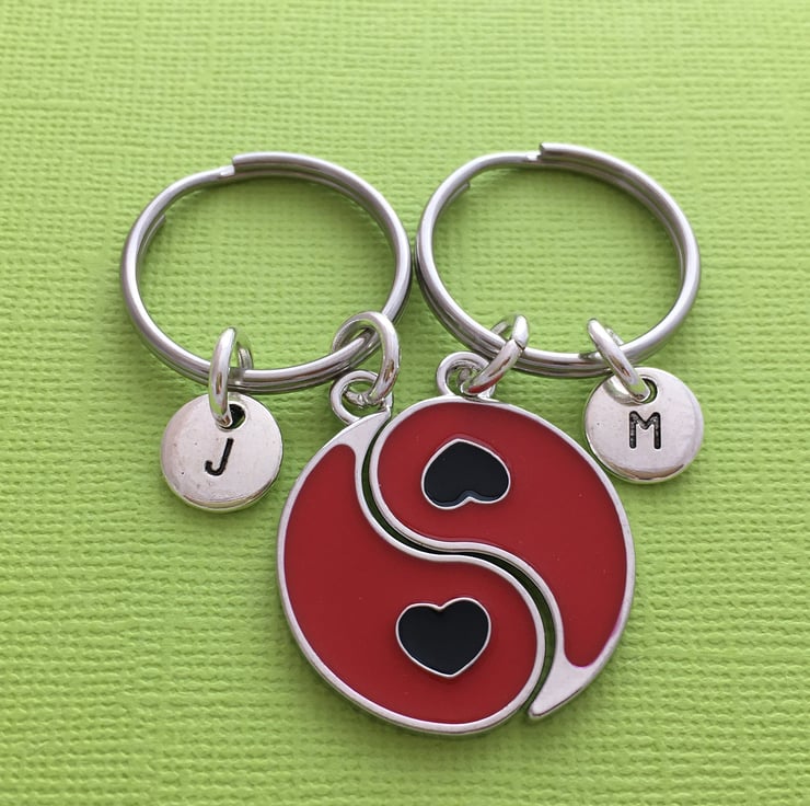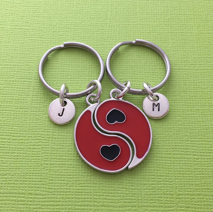 Pair of 2 stainless steel red and black enamel ying yang split pendant keychains, one for you and one for your bestie, other half, lover, crush. Each personalised with your required 10mm letter charm