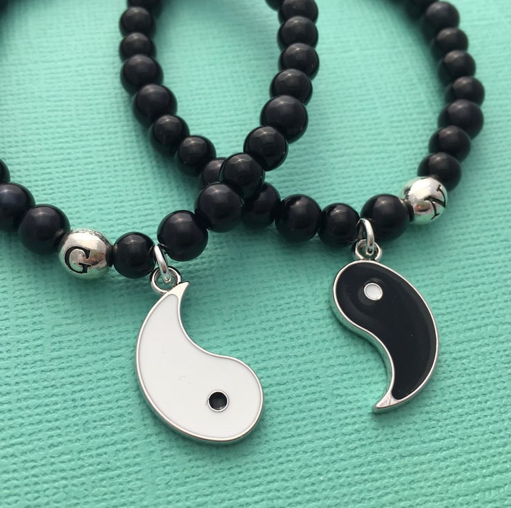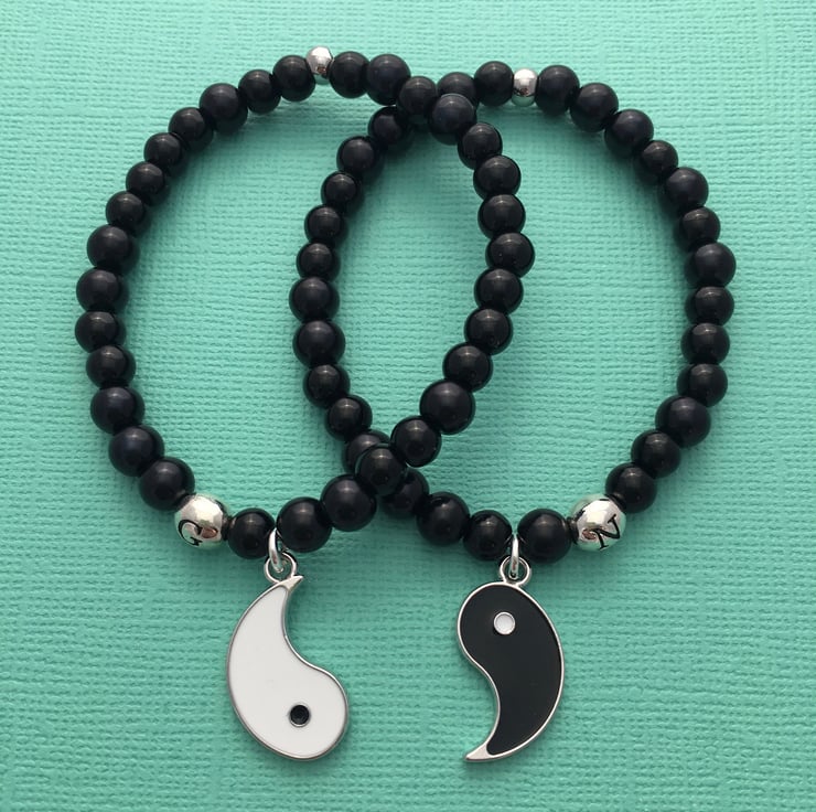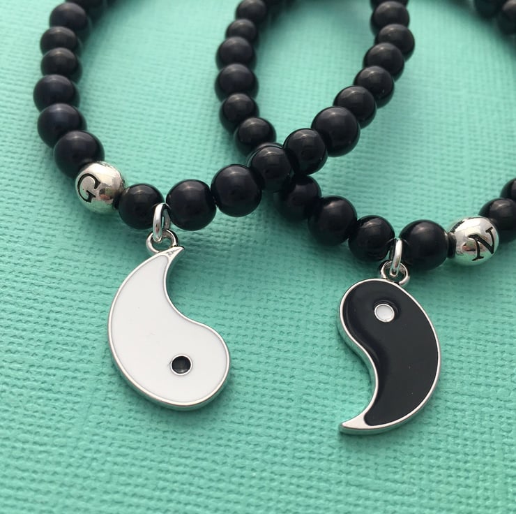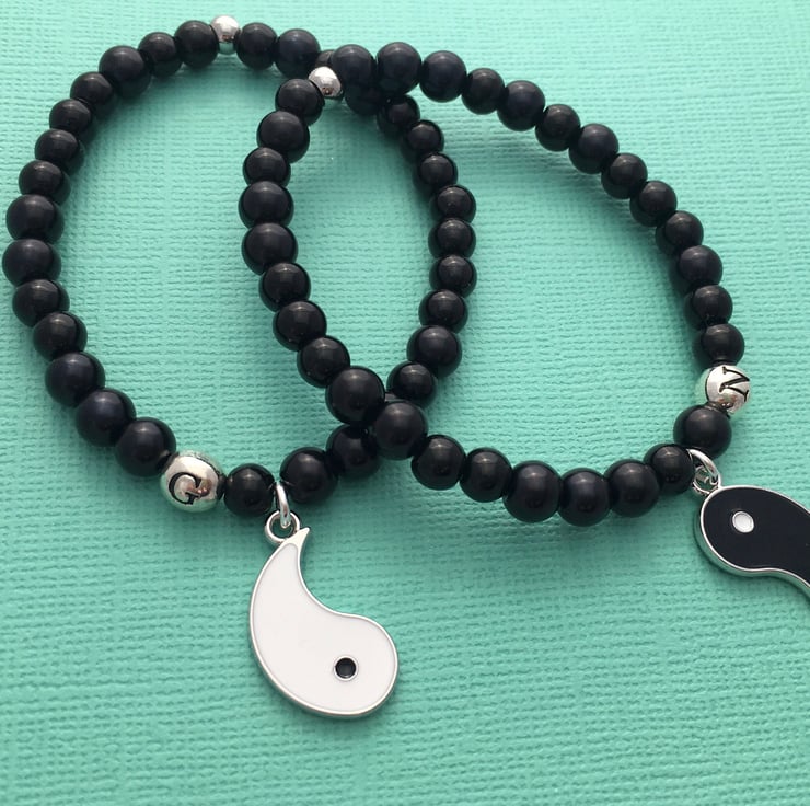 Bracelets are made up of 6mm black faux pearl glass beads, a metal letter bead (one per bracelet), and a set of enamel and alloy Yin Yang halved pendants. Beads are threaded on strong jewellery stretch elastic. Finished with a stainless steel spacer bead.