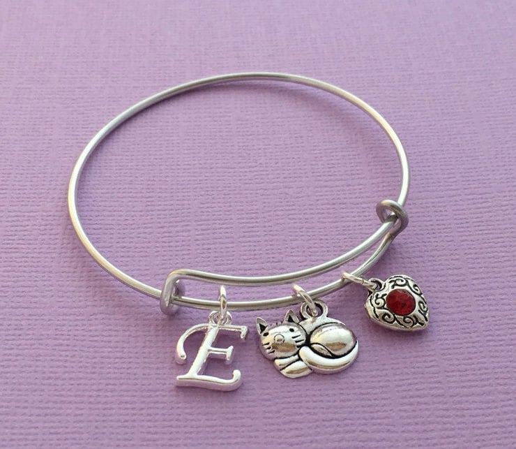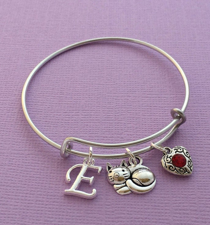 This pretty piece is made up of a stainless steel adjustable bangle, which consists of a cute little cat charm, rhinestone heart and letter charm of your choice