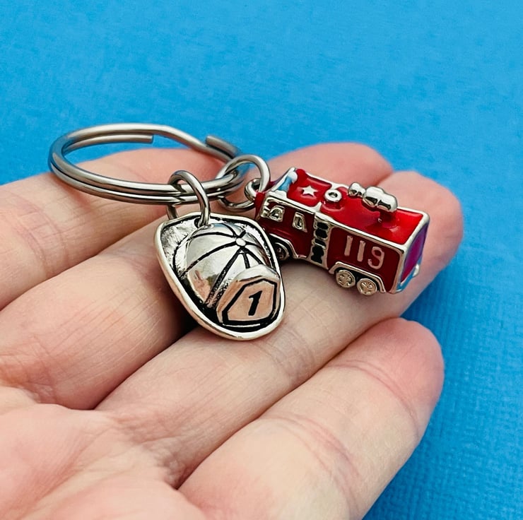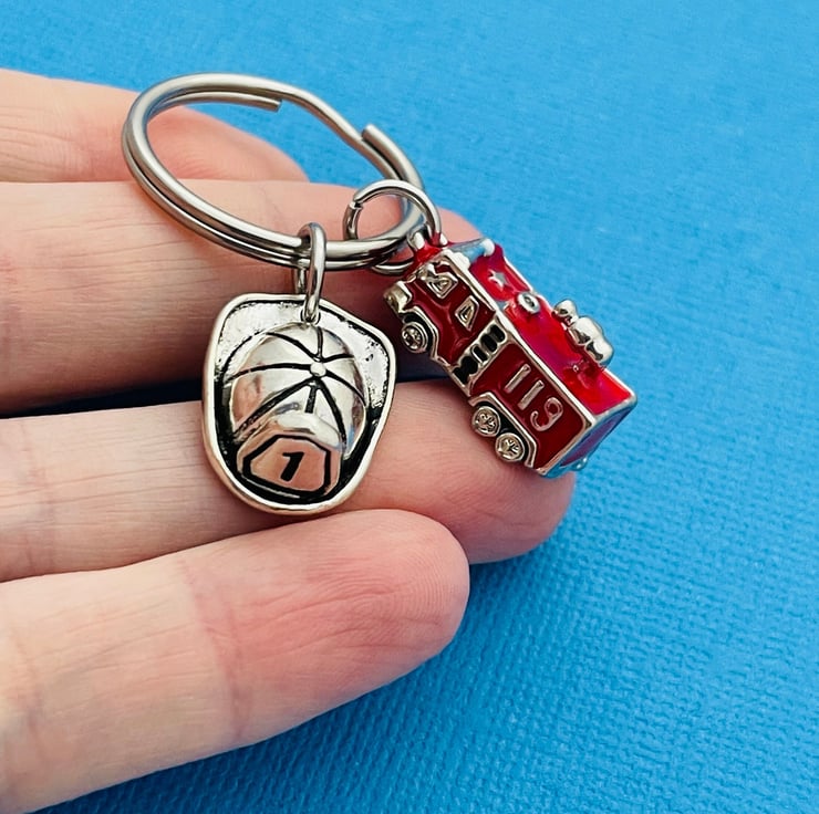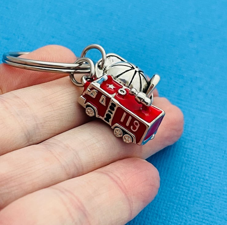 Keyring is made up of an enamel red fire engine charm and a Tibetan silver helmet charm