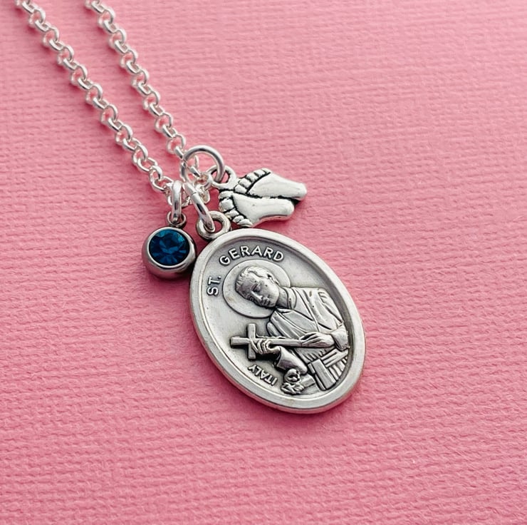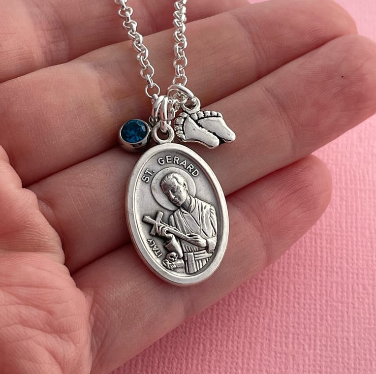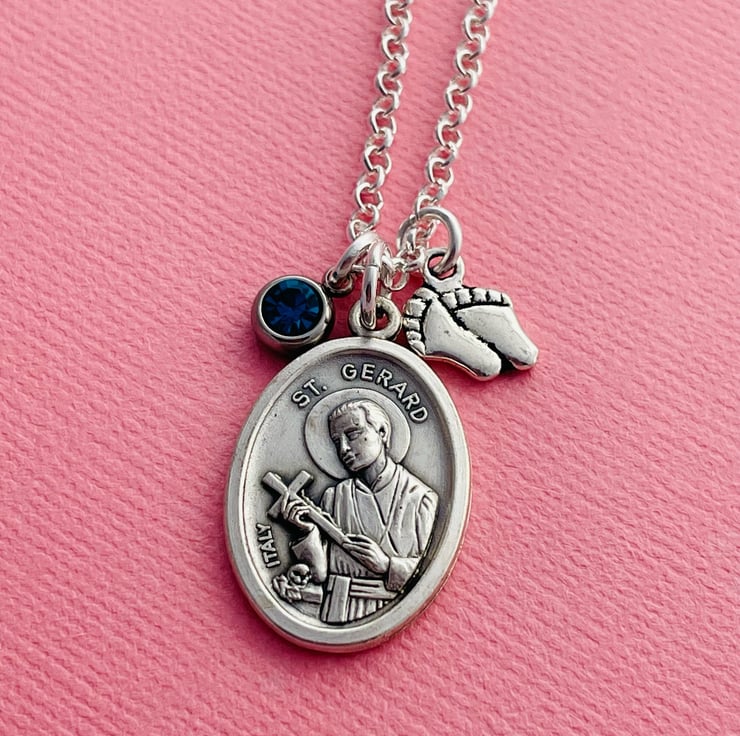 This necklace is made up of a Saint Gerard medallion (25x16mm), baby feet charm (can be made without baby feet if you wish, please just add a note upon checkout with your requirements) and finished with a birthstone charm, if required.