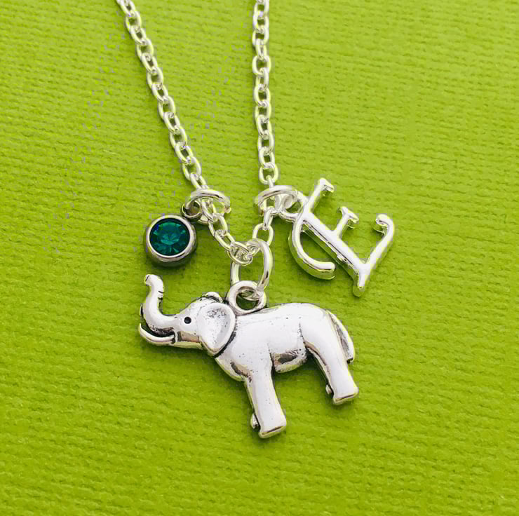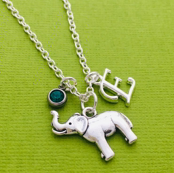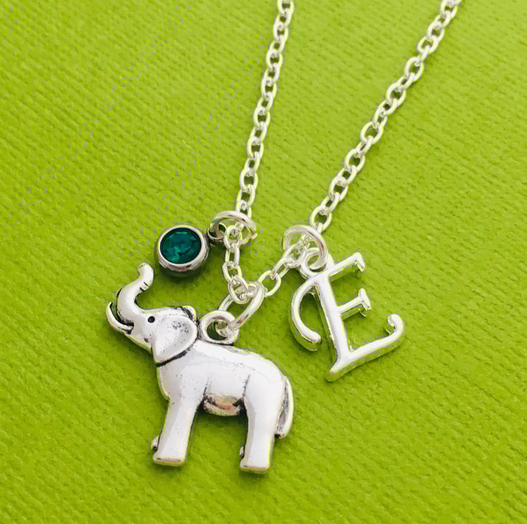 A pretty double sided tibetan silver elephant charm hangs alongside your required initial and birthstone charm