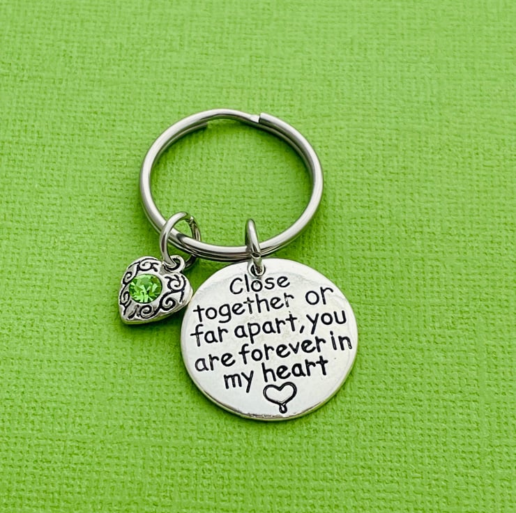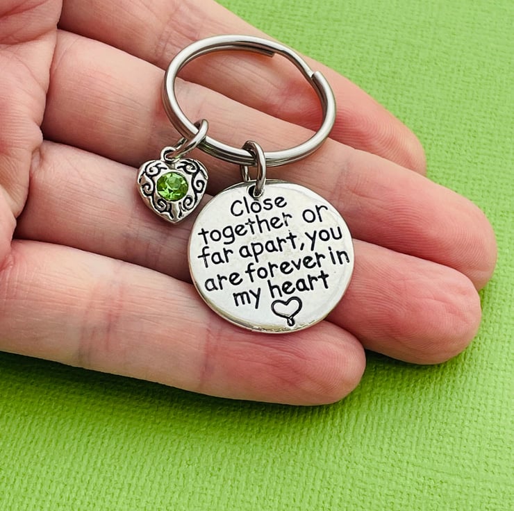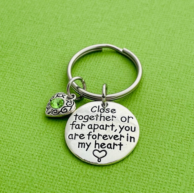 Keyring is made up of a pretty 25mm Close together or far apart you are forever in my heart charm and a rhinestone heart in your preferred colour (please make your selection from the dropdown menu)