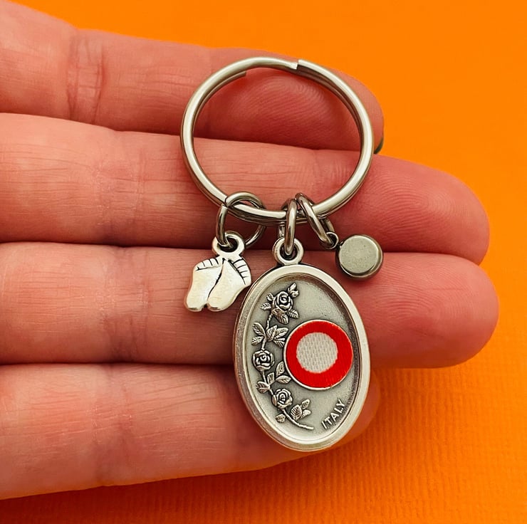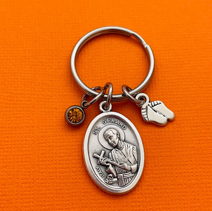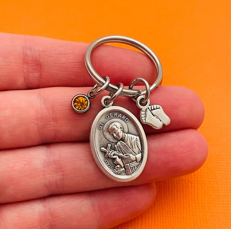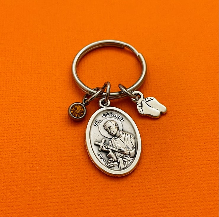 This keyring is made up of a Saint Gerard medallion (25x16mm), baby feet charm (can be made without baby feet if you wish, please just add a note to seller with your requirements) and finished with a birthstone charm, if required.