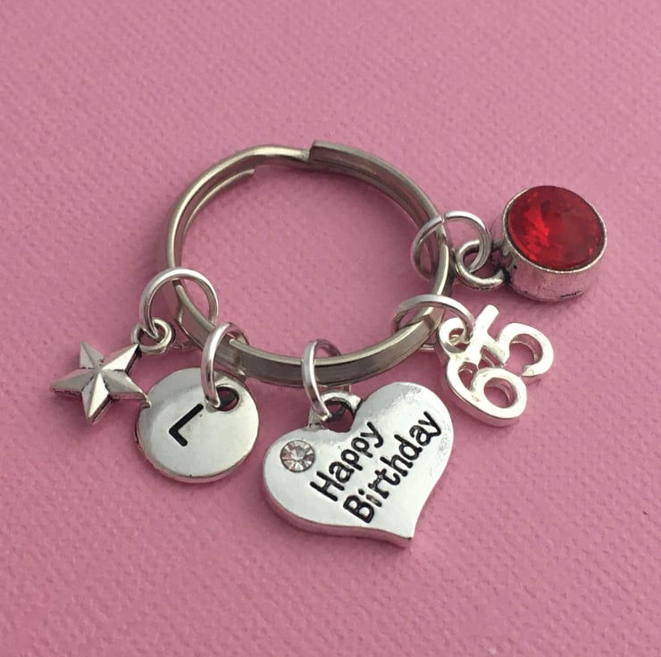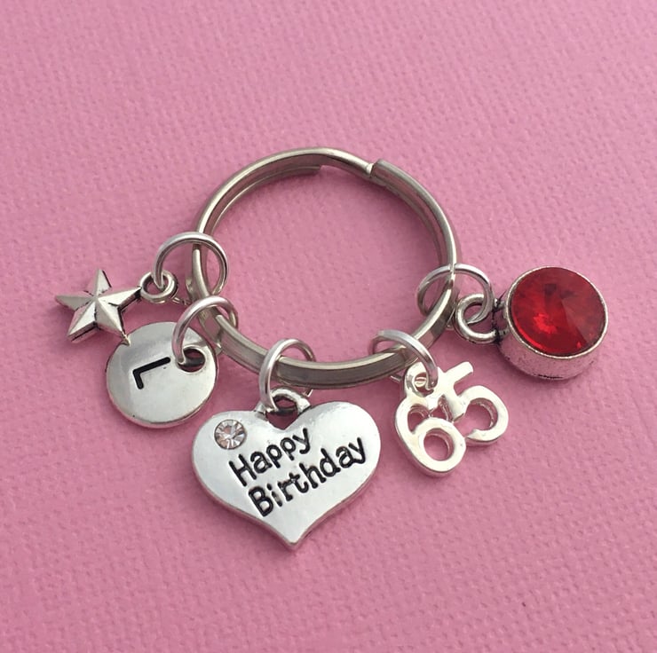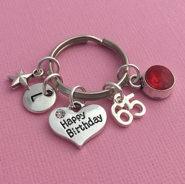Keyring is made up of a tibetan silver Happy Birthday heart charm, 65 number charm, puff star charm, initial and birthstone of your choice