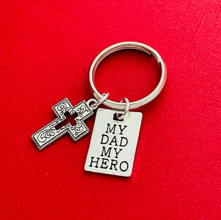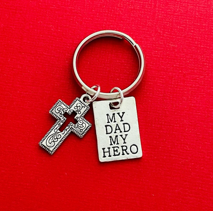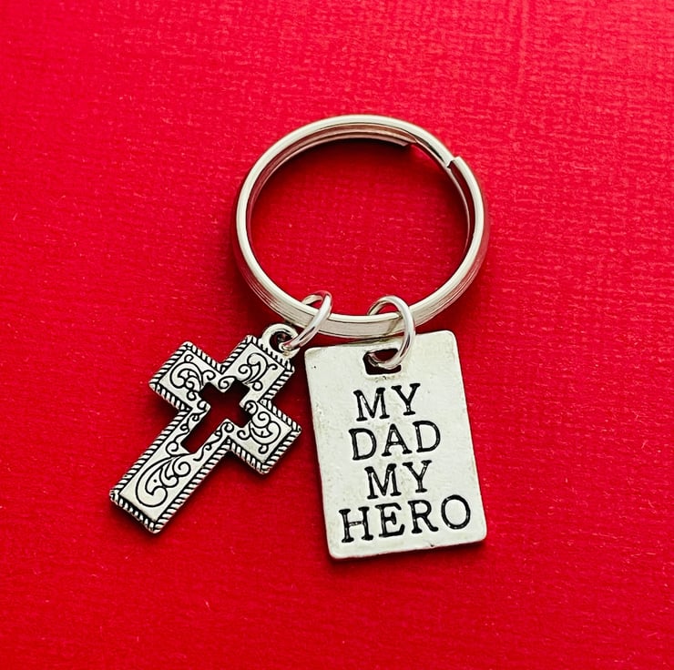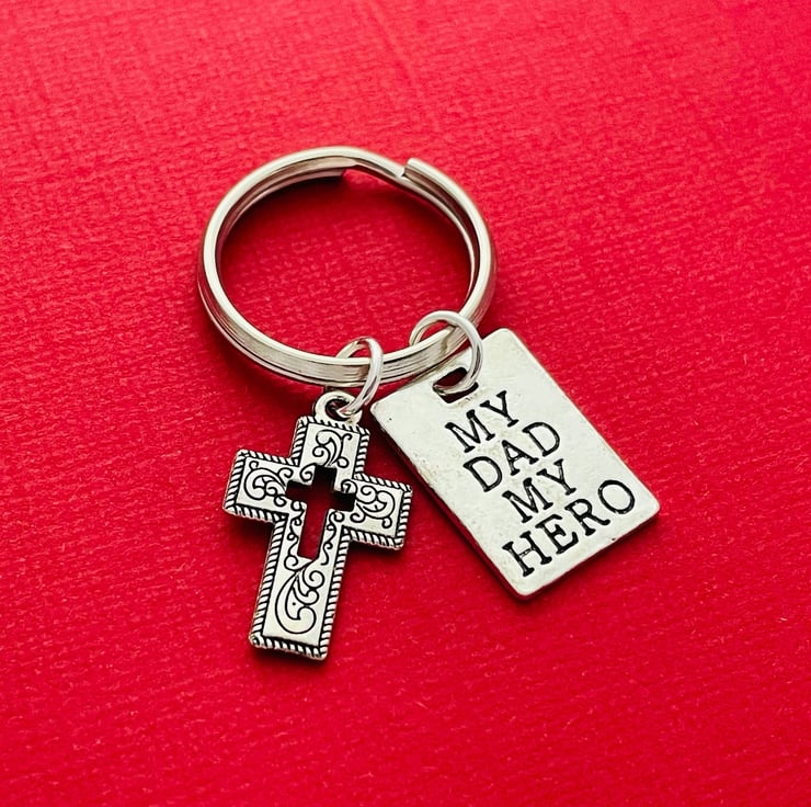 Keyring is made up of a 15.8 x 22.3mm Tibetan silver charm which reads My Dad My Hero and a decorative cross charm
