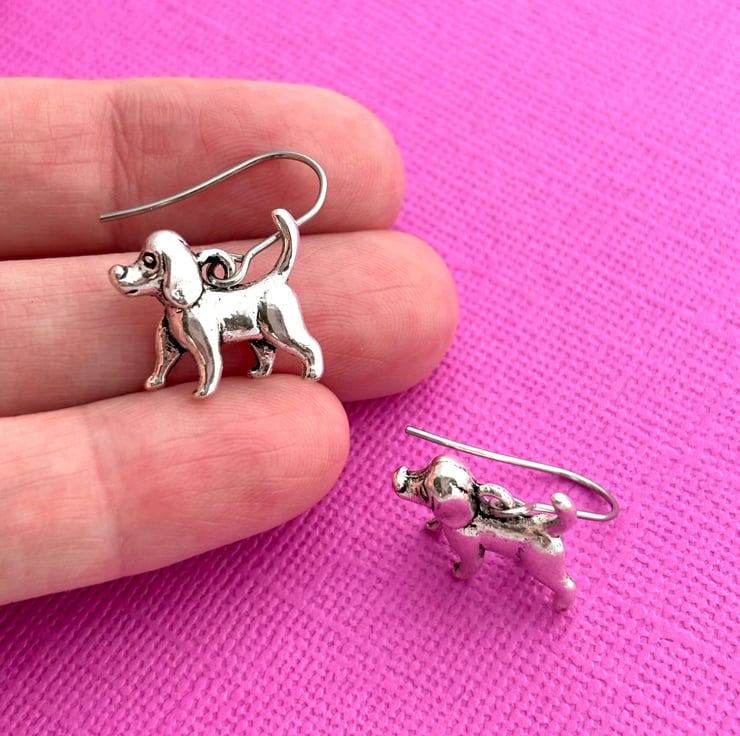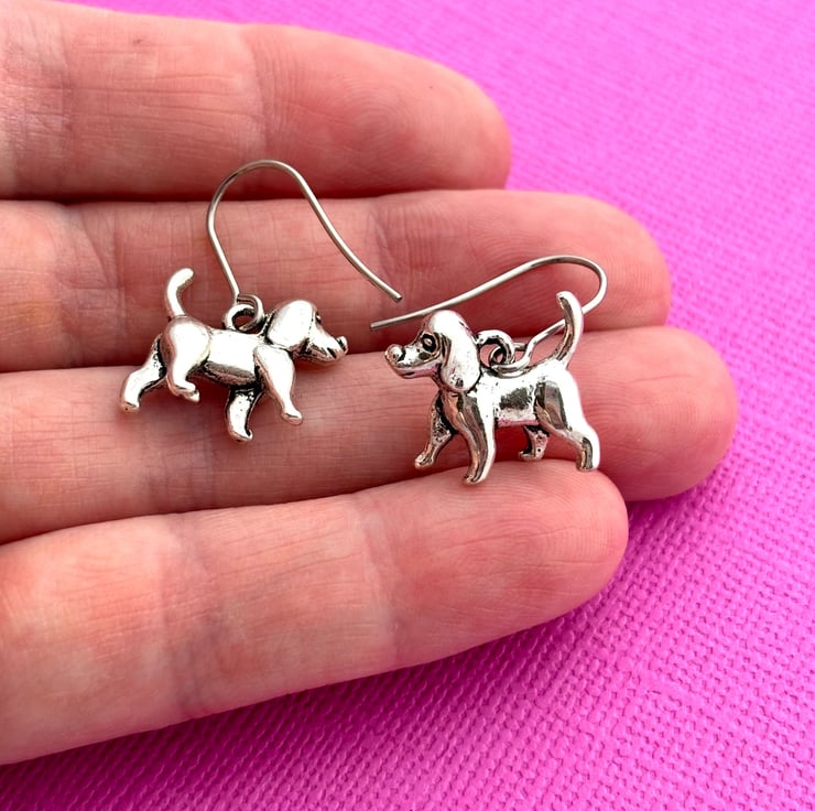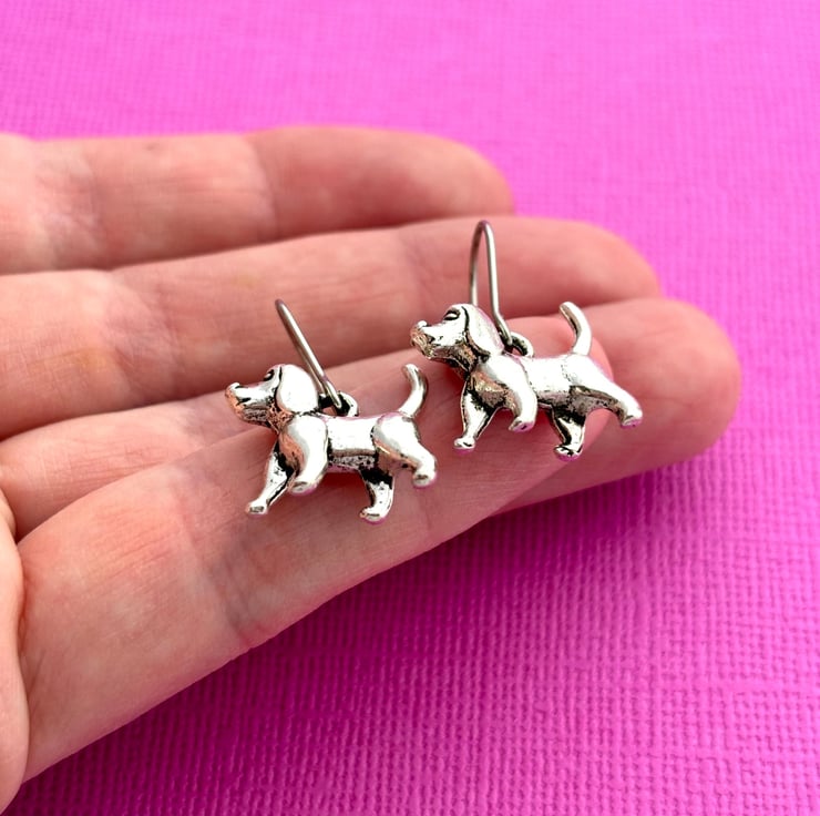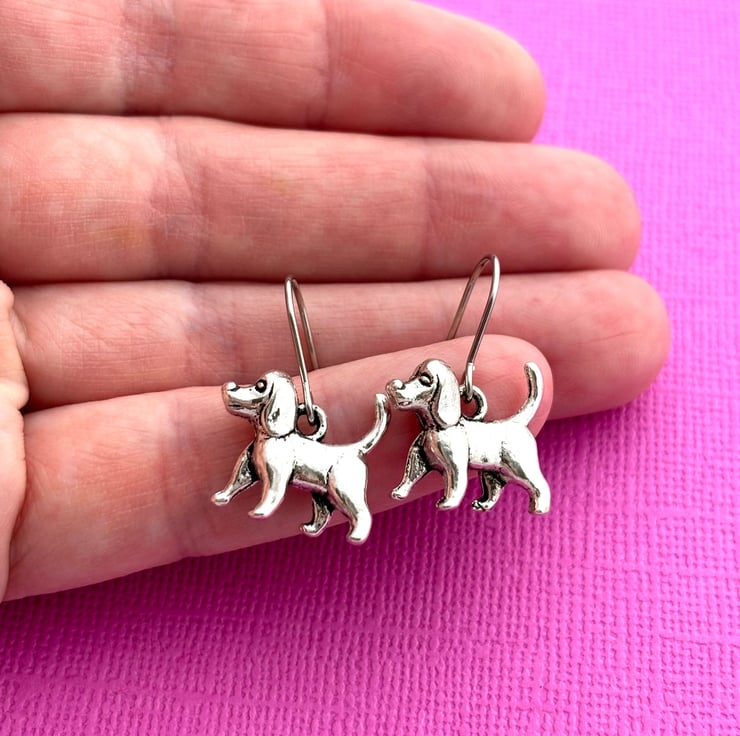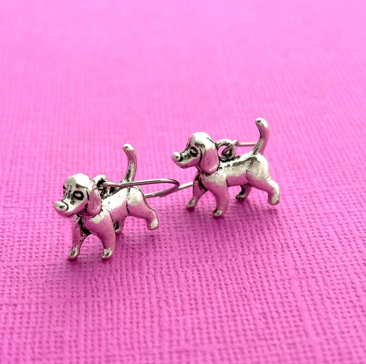 These super cute earrings are made up of antiqued silver plated dog charms