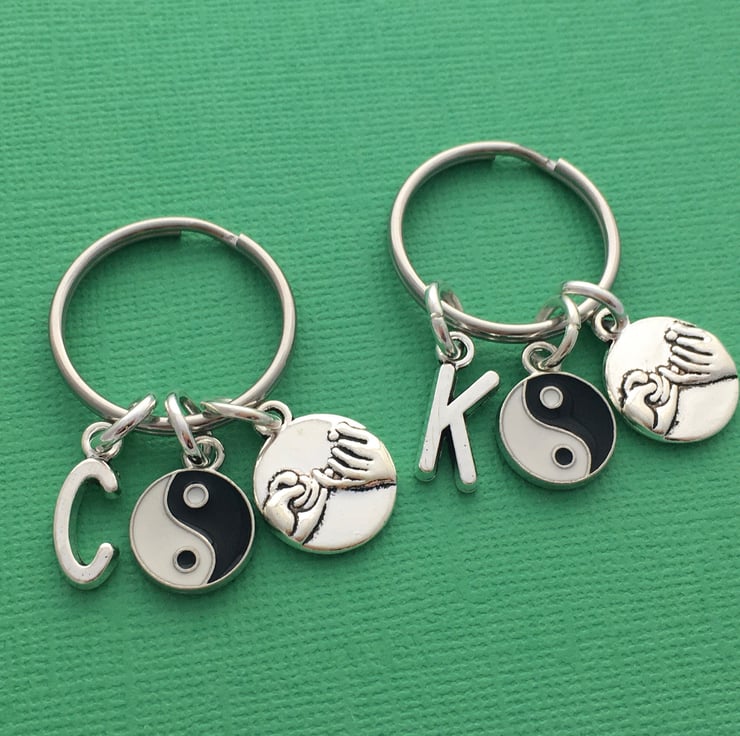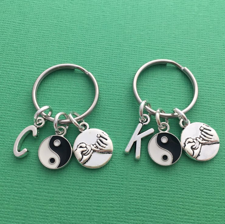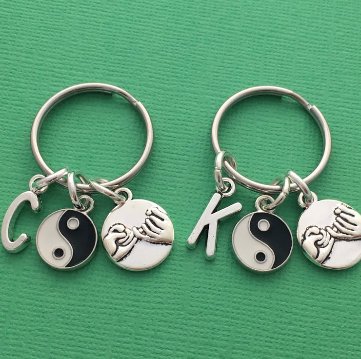 These personalized keychains are made up of tibetan silver double sided Pinky Promise charms, enamel Ying Yang charms and alloy initial charms
