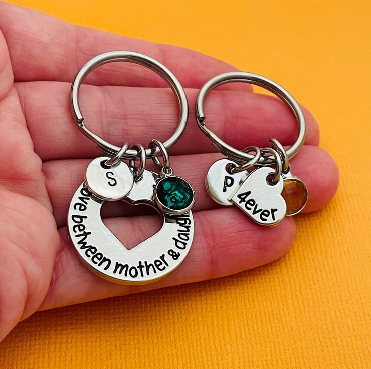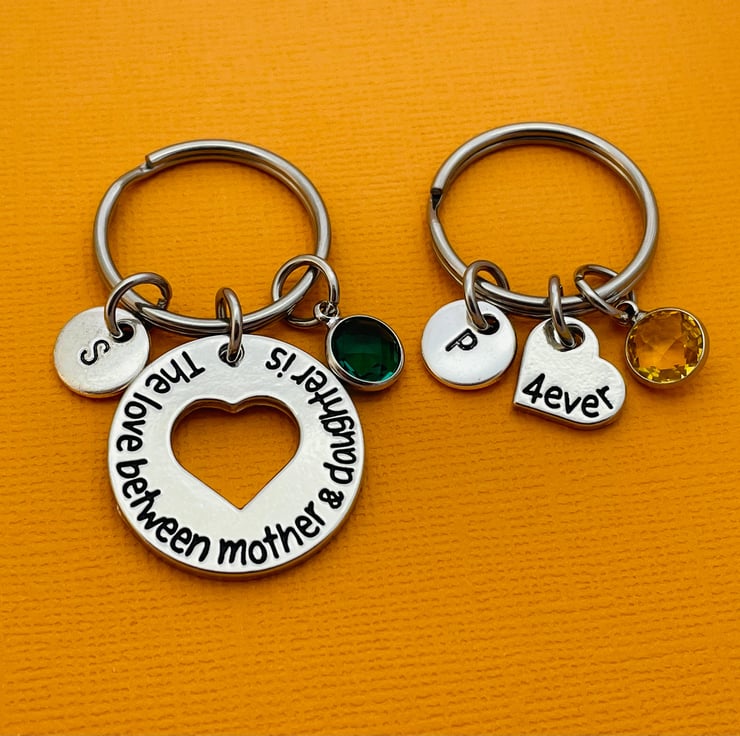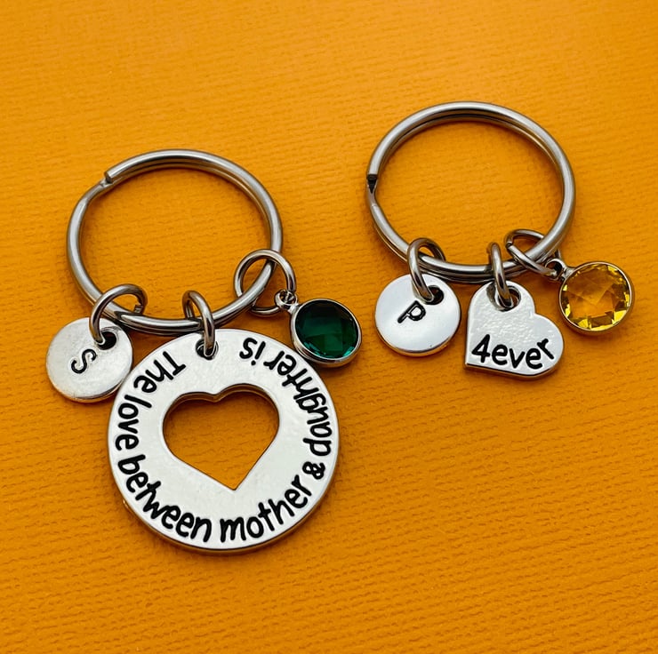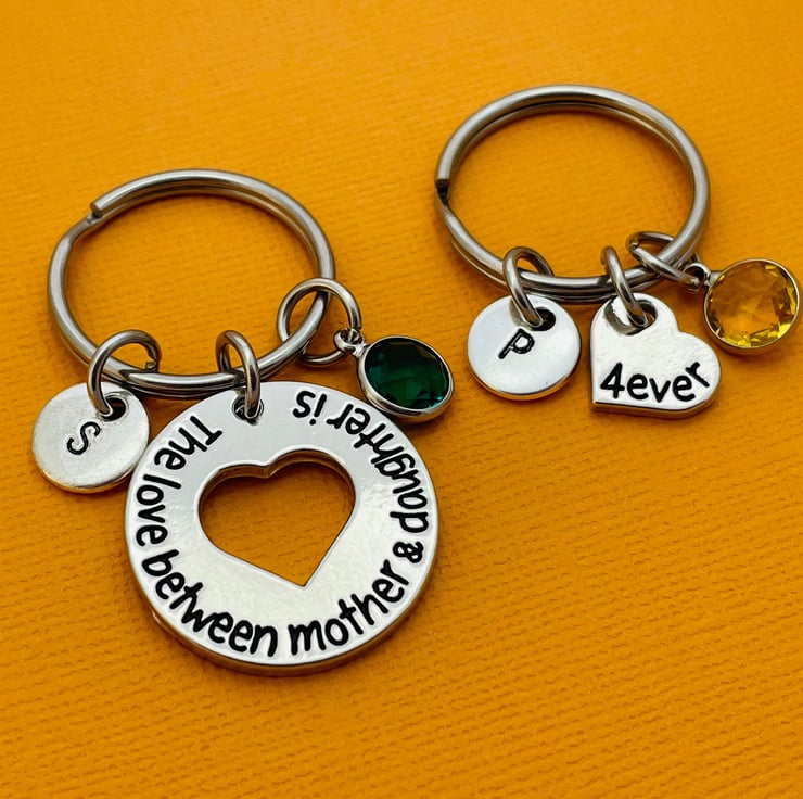 One keyring has a round circle which reads The love between mother & daughter is . Other keyring has a little heart which reads 4ever .