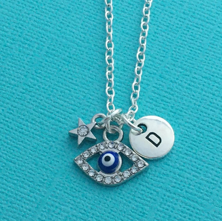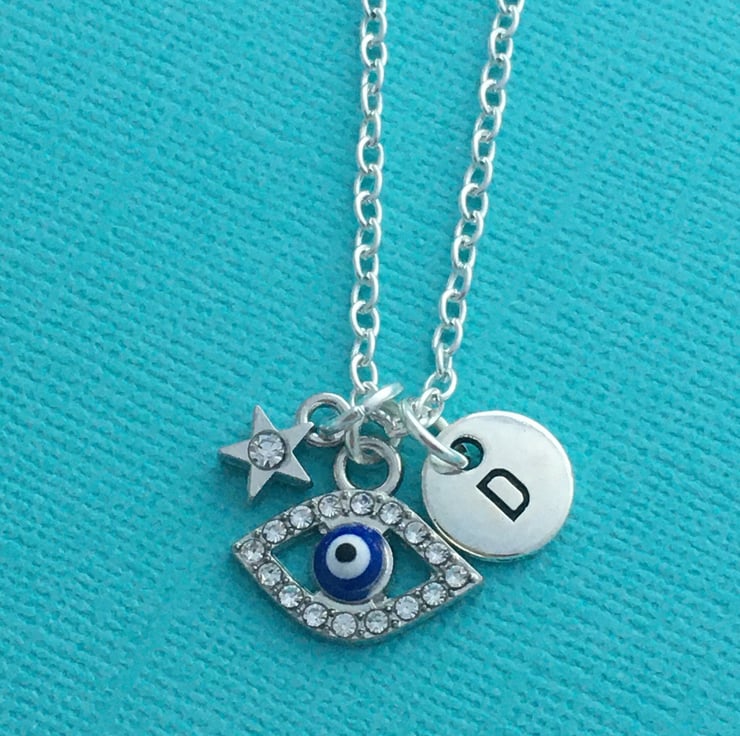 Necklace is made up of a silver plated rhinestone evil eye charm (17x14mm), silver plated rhinestone star and an initial charm (9mm)
