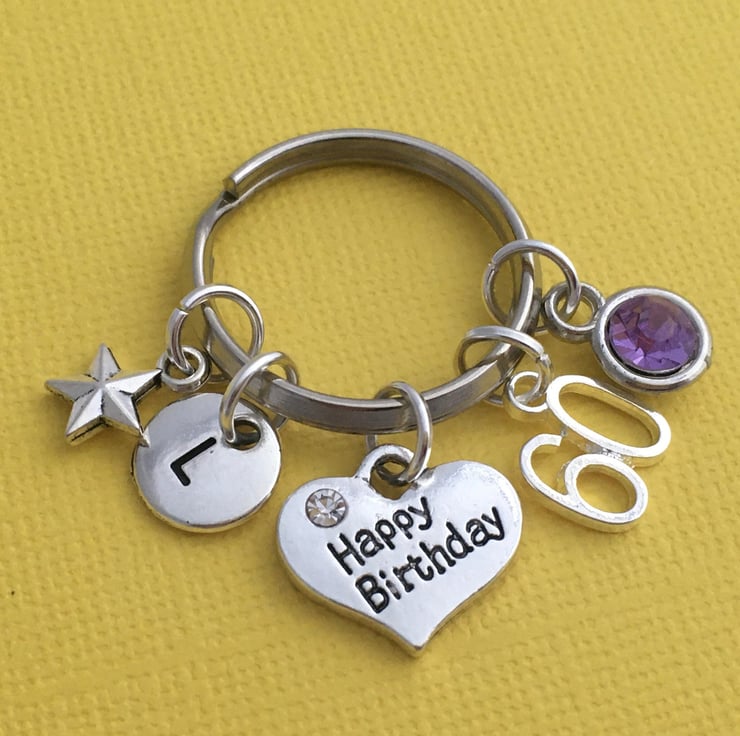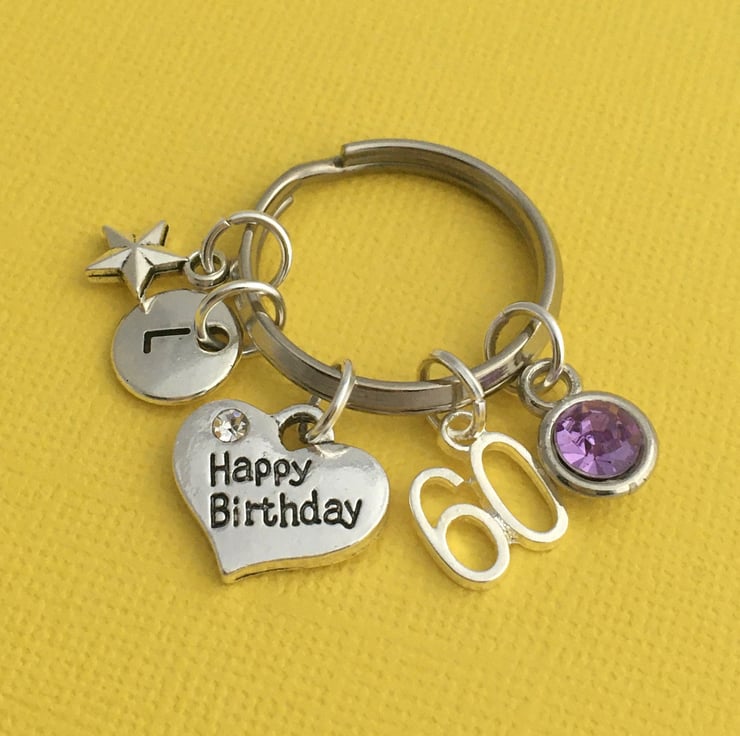 Keyring is made up of a tibetan silver Happy Birthday heart charm, number 60 charm, puff star charm, initial and birthstone of your choice