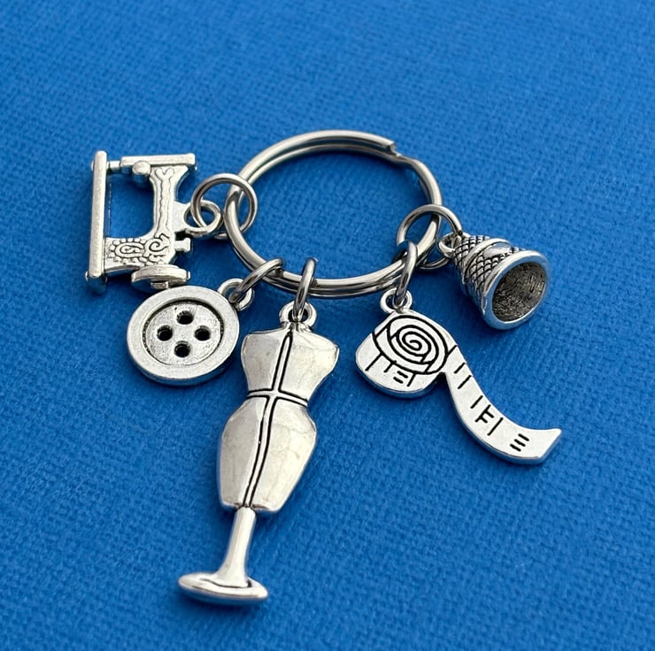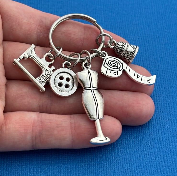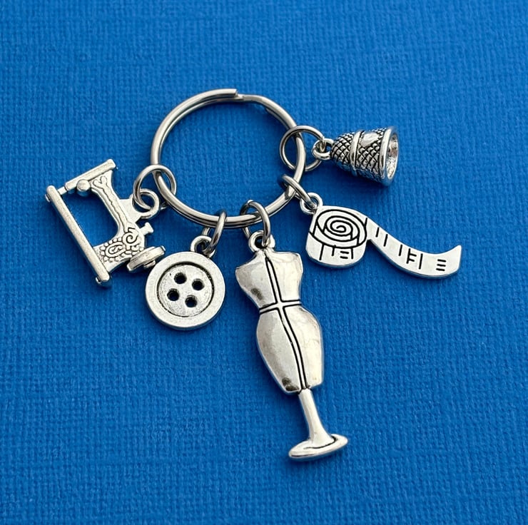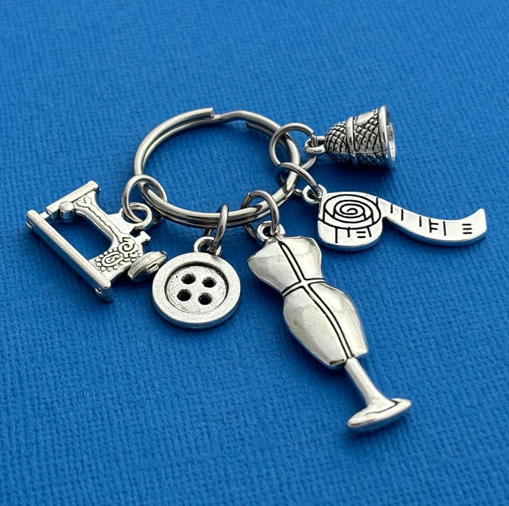 Keychain is made up of a Mannequin charm, a thimble charm, measuring tape charm, button charm and a sewing machine charm