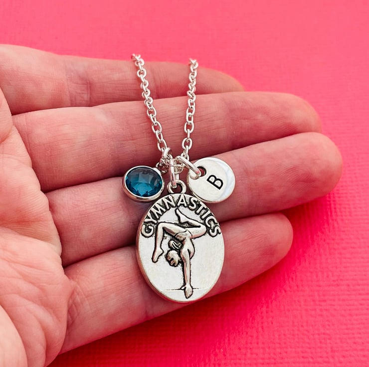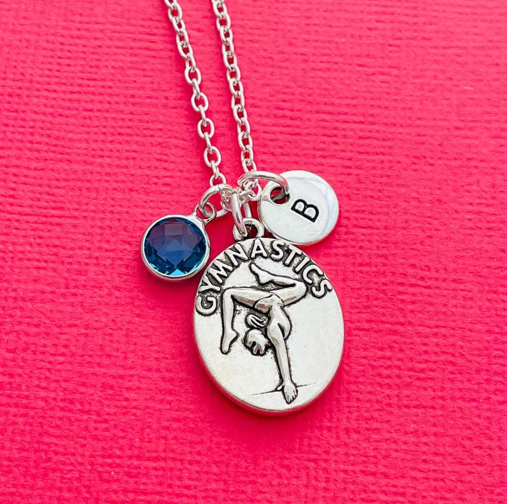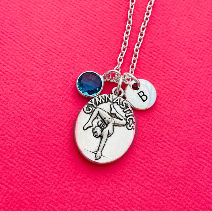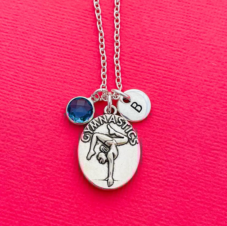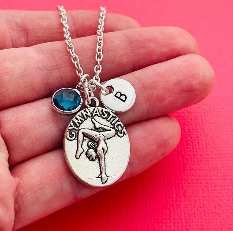 This super cute necklace is made up of a gymnastics charm, letter charm and birthstone