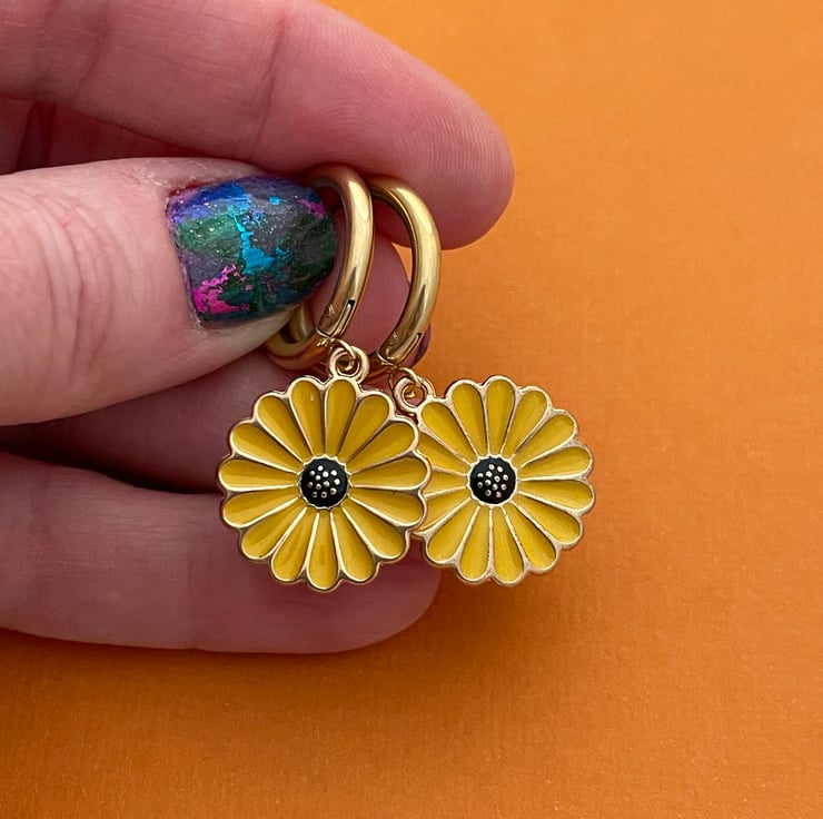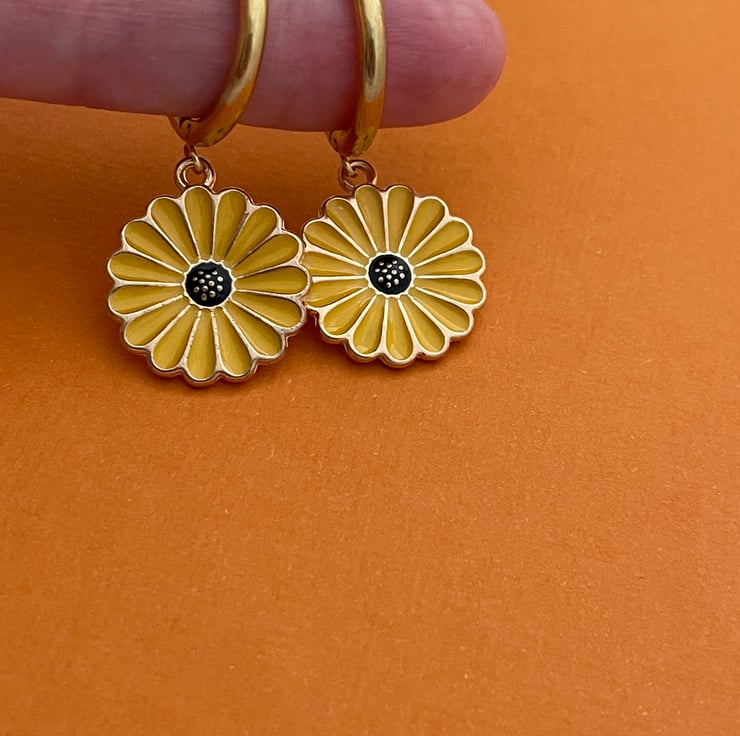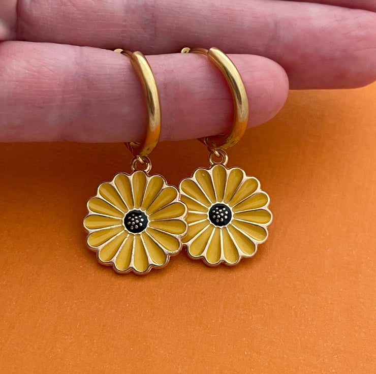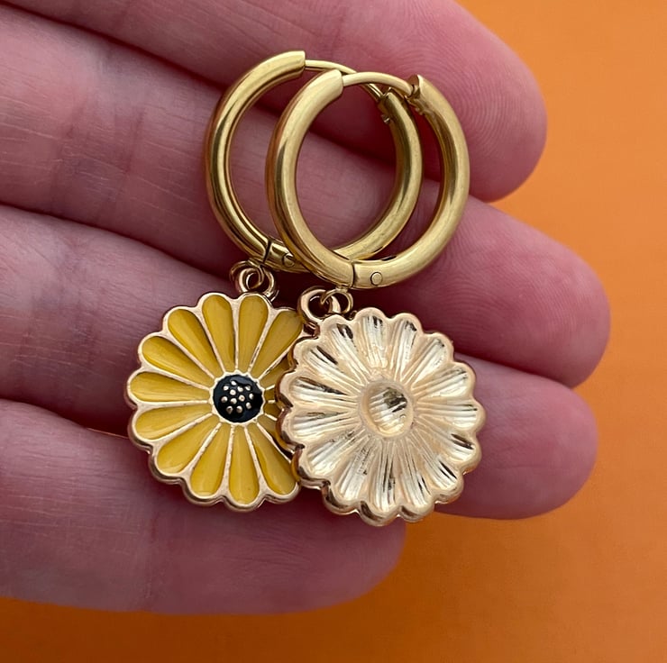Earrings consist of gold plate with yellow enamel sunflower charms and stainless steel gold plated hoop earrings