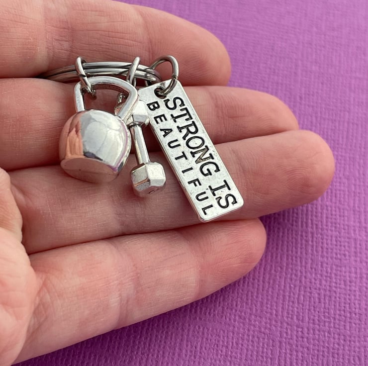 This keychain is made up of a kettle bell charm; dumbbell charm and a Strong is Beautiful charm