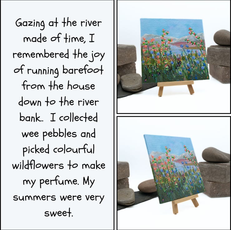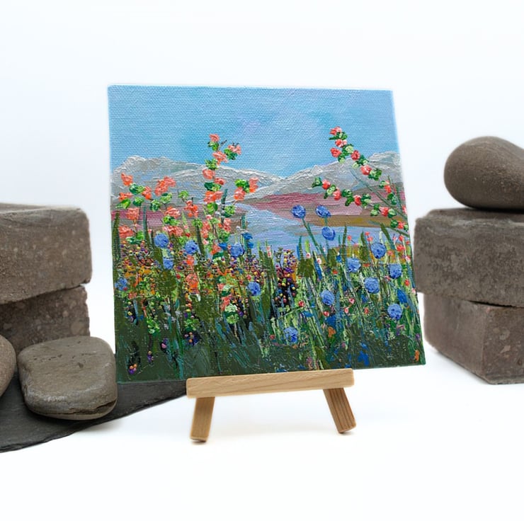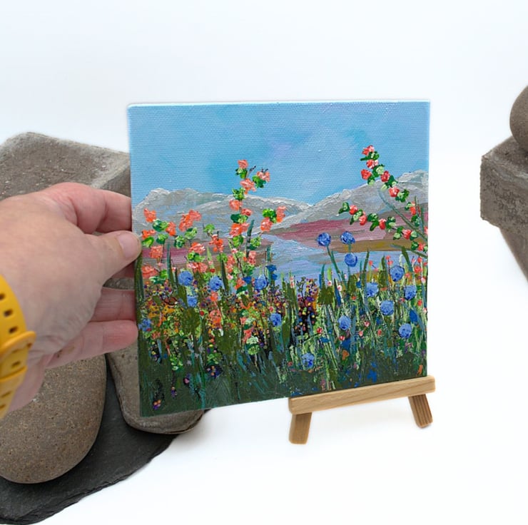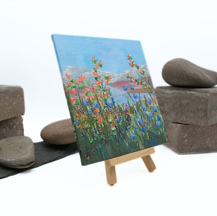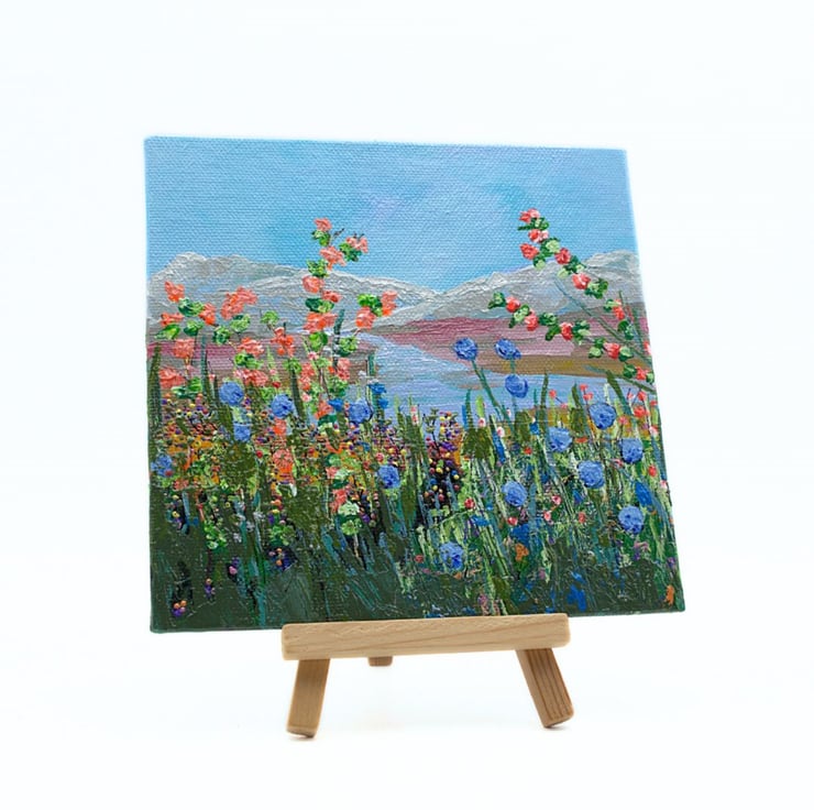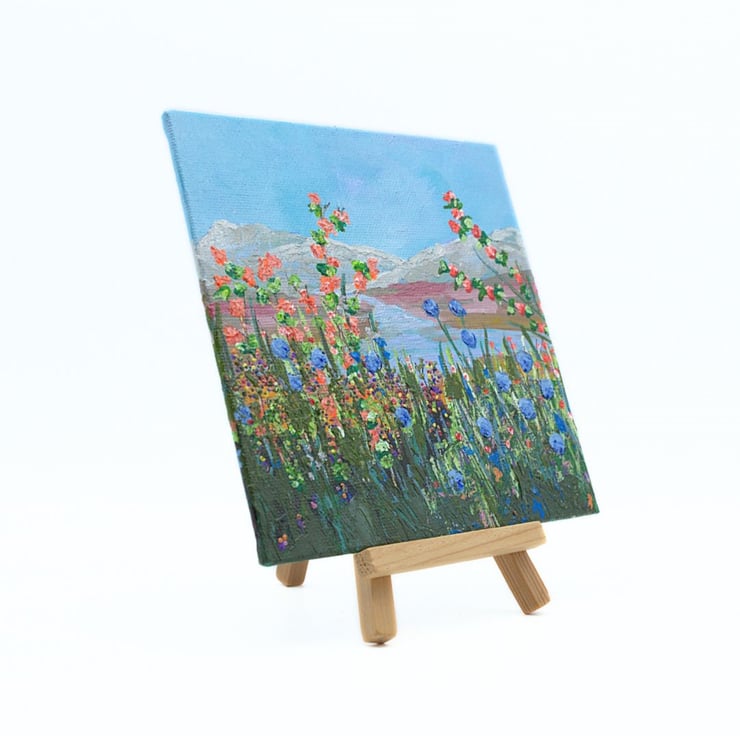 This is a small colourful landscape painting. The sky is a clear, light blue and the mountains in the distance have a dusting of snow on their tops. The river is clear and reflects the blue of the sky. The foreground is dominated by a range of colourful wildflowers and grasses that reach tall to the light of the day. The artwork has been completed in professional quality acrylics. I have used a range of painting knives, twigs and brushes to apply the acrylic paint across the canvas panel.