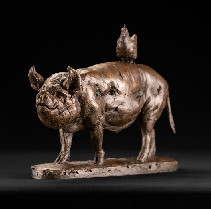 “I was happily asked to contribute sculpting sections for the Dorling Kindersley ‘Artist’s Manual’, and to include photographs of sculptures that represented different types of modelling. So I began my Pig and Chicken sculpture, which I’d had on my mind for a little while, for the realistic sculpting photographs. It is based on one of our own rescue pigs here, and a rescue battery hen called Daisy who found it fun to flap to the top of Pog’s back and balance there, sometimes even as he moved about.