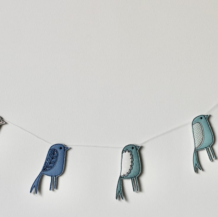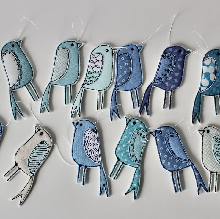 Each of the twelve birdies suspended along this garland, is sewn using a combination of 100% wool felt, cotton cloth and free hand machine embroidery; multiple layers of cloth are sewn together and cut out by hand using very sharp scissors.