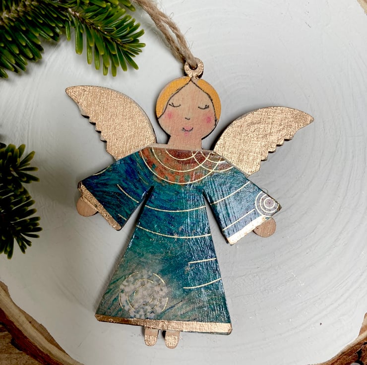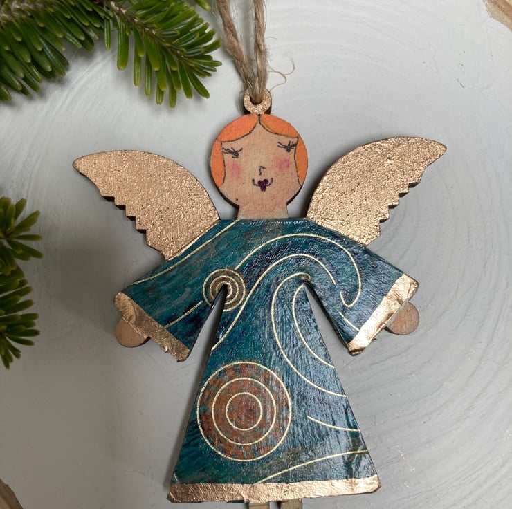 The angels are made from wood and have been handpainted and decoupaged. Gold leaf has been added to the edges of the Angel dresses. The wings are gold leaf. Each side has been painted with a slightly different face and hair colour.