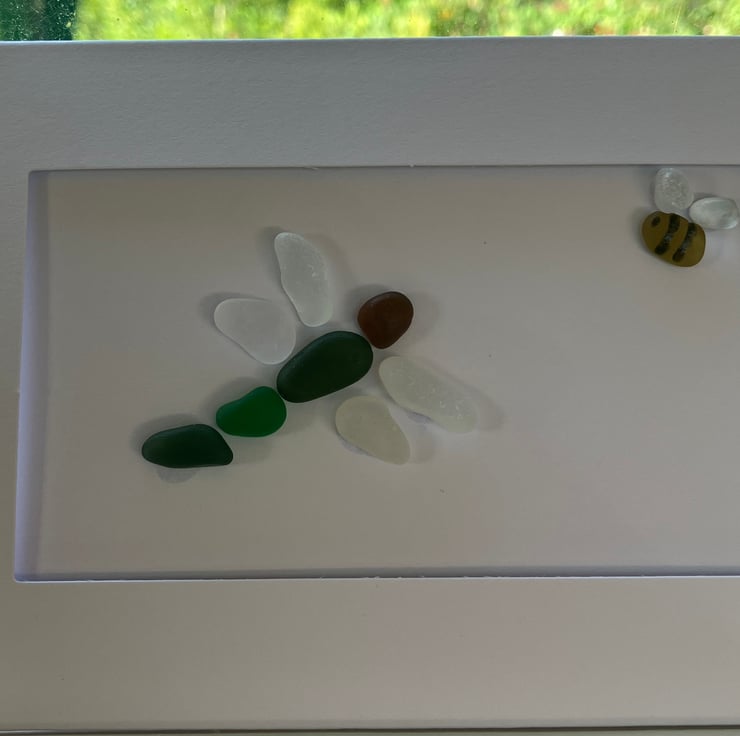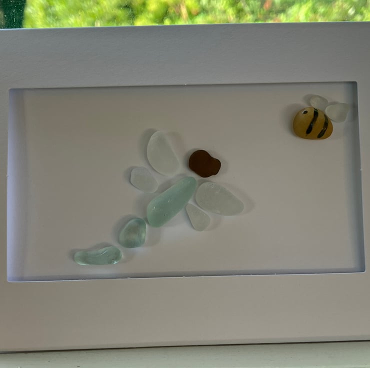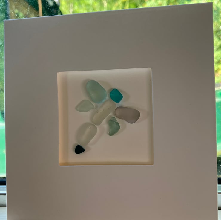 Seaglass art on an individual card for you to personalise with your own message. Each design is individual due to the uniqueness of each piece of glass used in the design